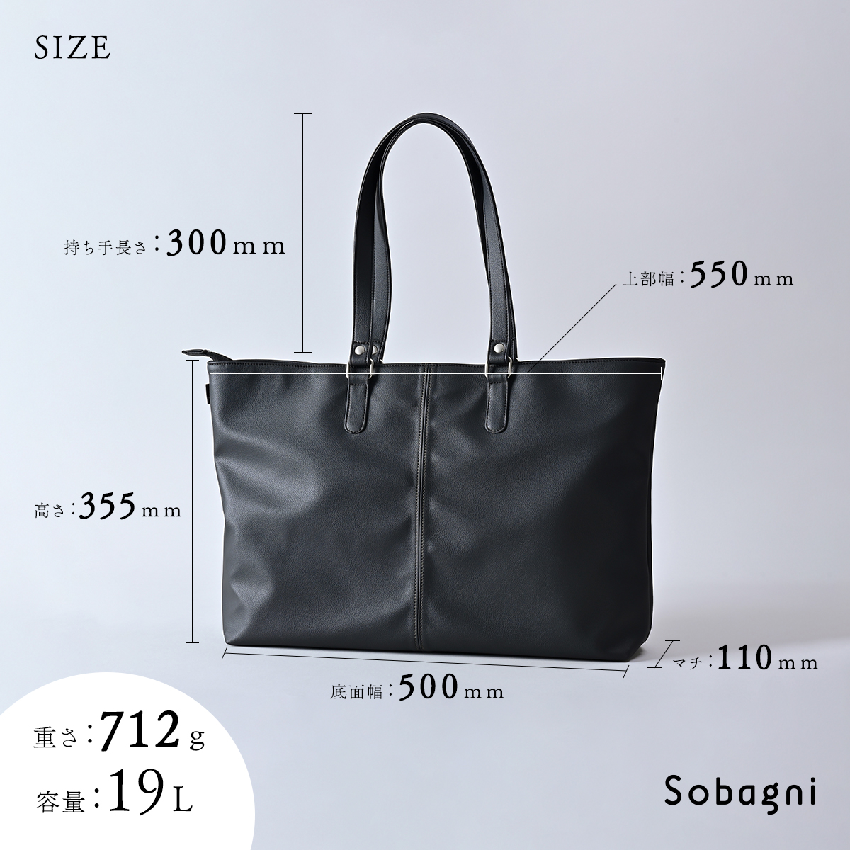 サイズ詳細上部幅:550mm 底面幅:500mm 高さ:355mm マチ:110mm 持ち手長さ:300mm