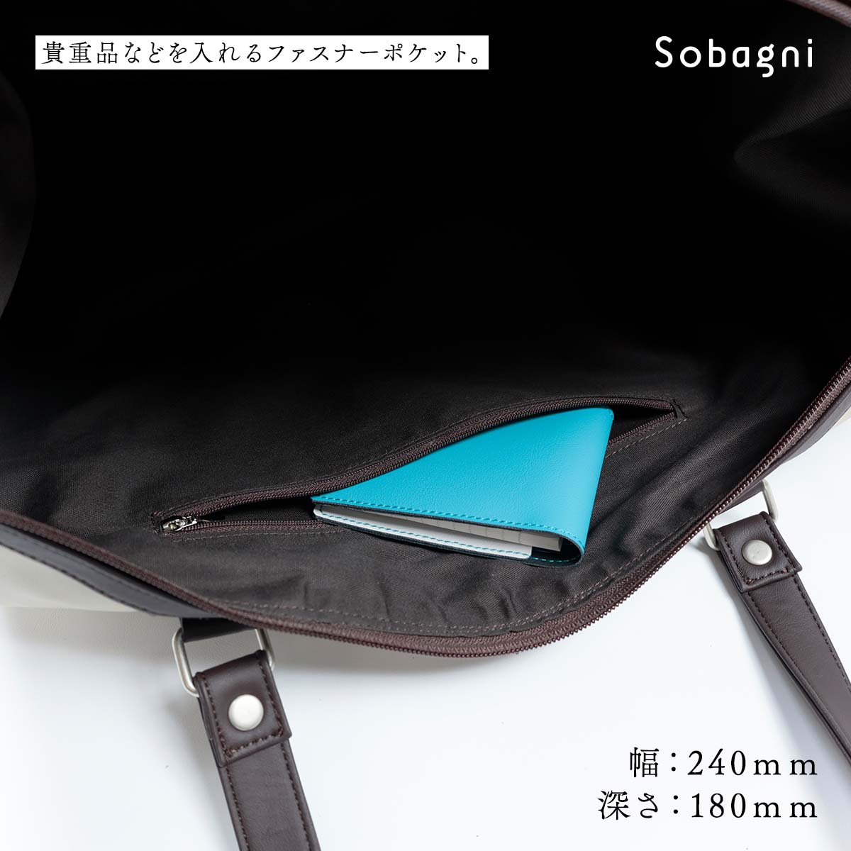 内部には大きめのファスナー付きポケットを配備しており、長財布も入れられます。反対側にはスマートフォンやキーケースなどが入るポケットが2つあります。