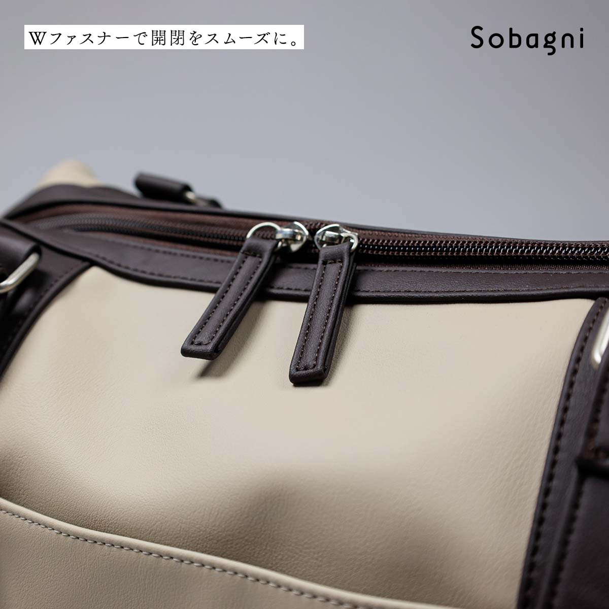 バイカラーでオシャレに持てるSobagniのボストンバッグです