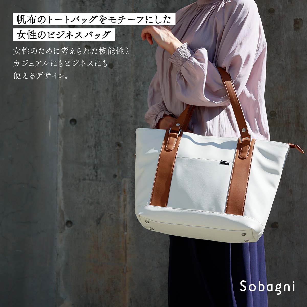 Sobagniのエシカル合皮の特長を活かした女性用ビジネスバッグ「あったらいいな」を形にしました。