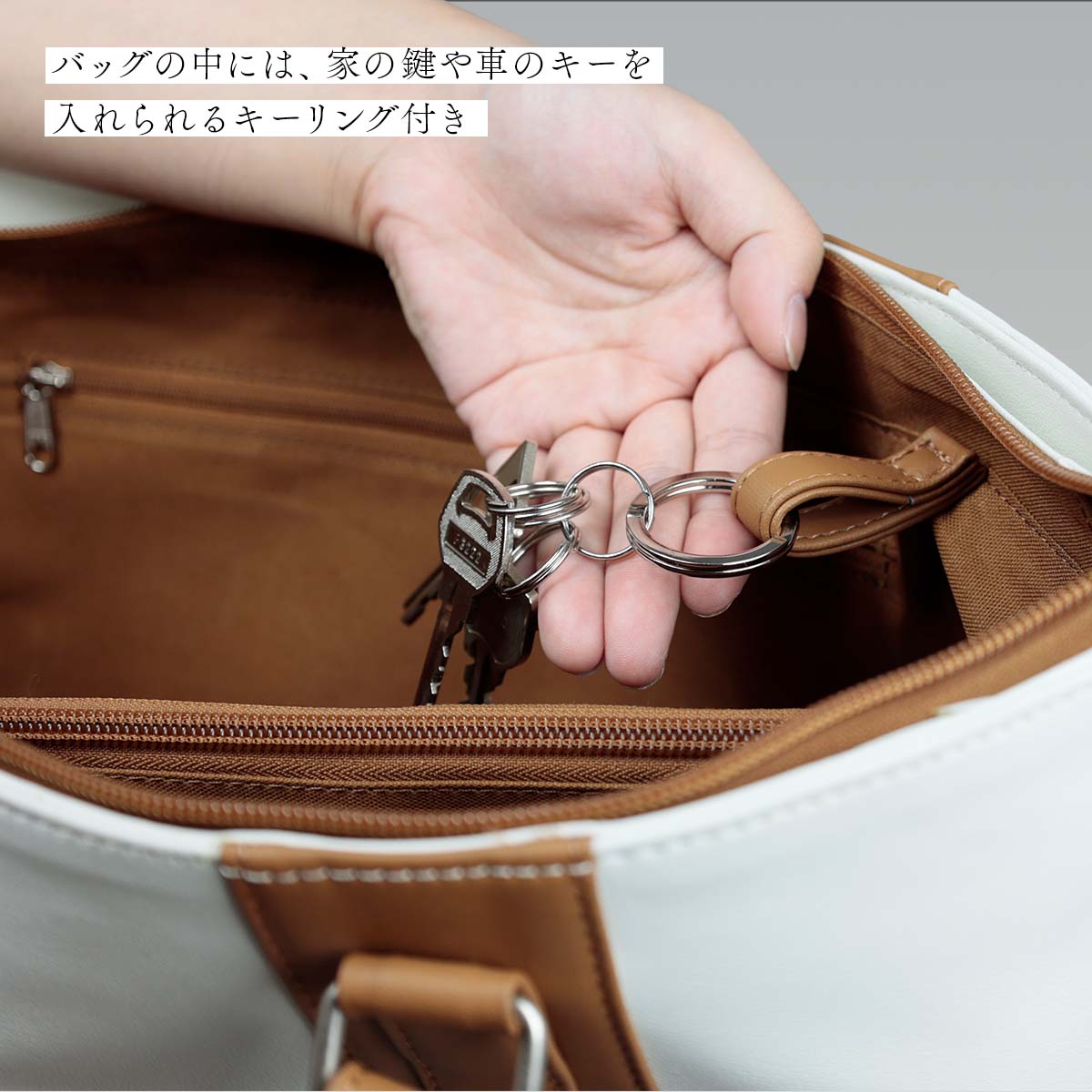 また、バッグの中にナスカンやキーホルダーを取り付けられるキーリング付き。鞄の中でどこにいったか分からなくなりがちな鍵やパスケースなどを取り付けることができます。
