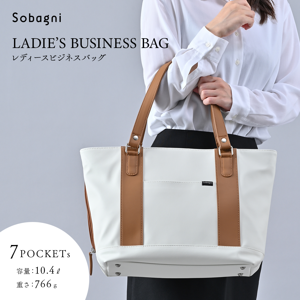 白いビジネスバッグ。軽くて清潔感があって女性らしいけど、帆布のトートじゃカジュアルすぎるし、汚れも目立つ。