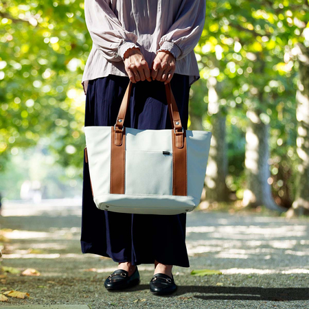 肩掛け仕様のトートバッグ型。一見カジュアルな帆布のトートバッグにも見えますが、エシカル合皮製なのでかっちり感あり。