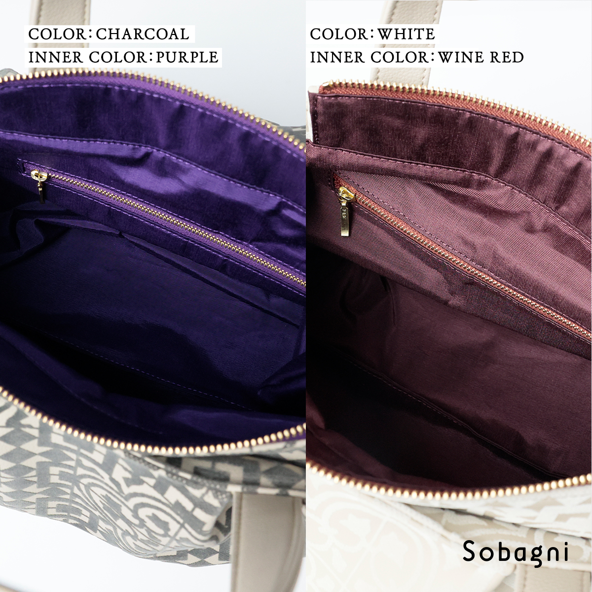 ファスナーや内生地には、上品さを感じつつも表地とのコントラストが際立つ配色としました。
