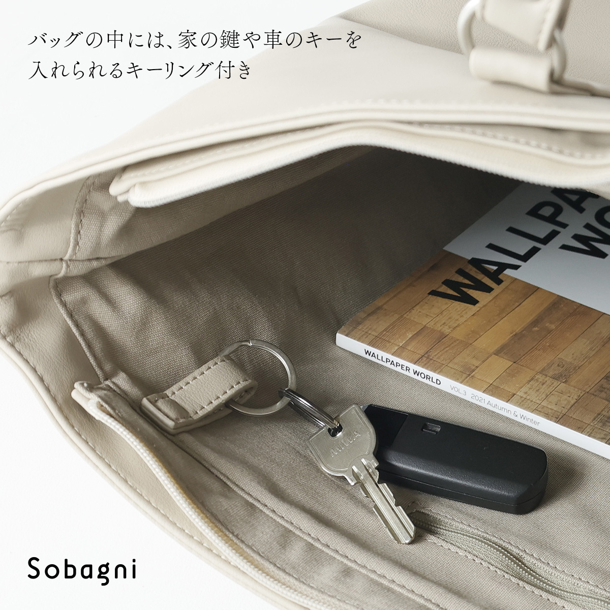 内装にはファスナー付きポケットと、鍵や車のキーなど付けられるキーリング、多目的ポケットとペンホルダーを配置し、ユーザビリティーを考慮した仕様に。