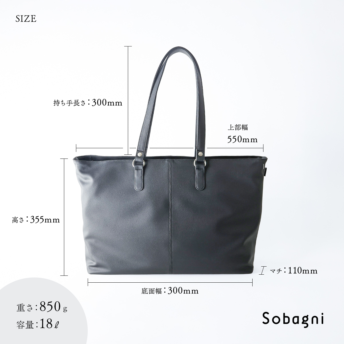 | サイズ詳細 | 高さ:355mm 上部幅:550mm 底面幅:300mm マチ:110mm 持ち手長さ:300mm |