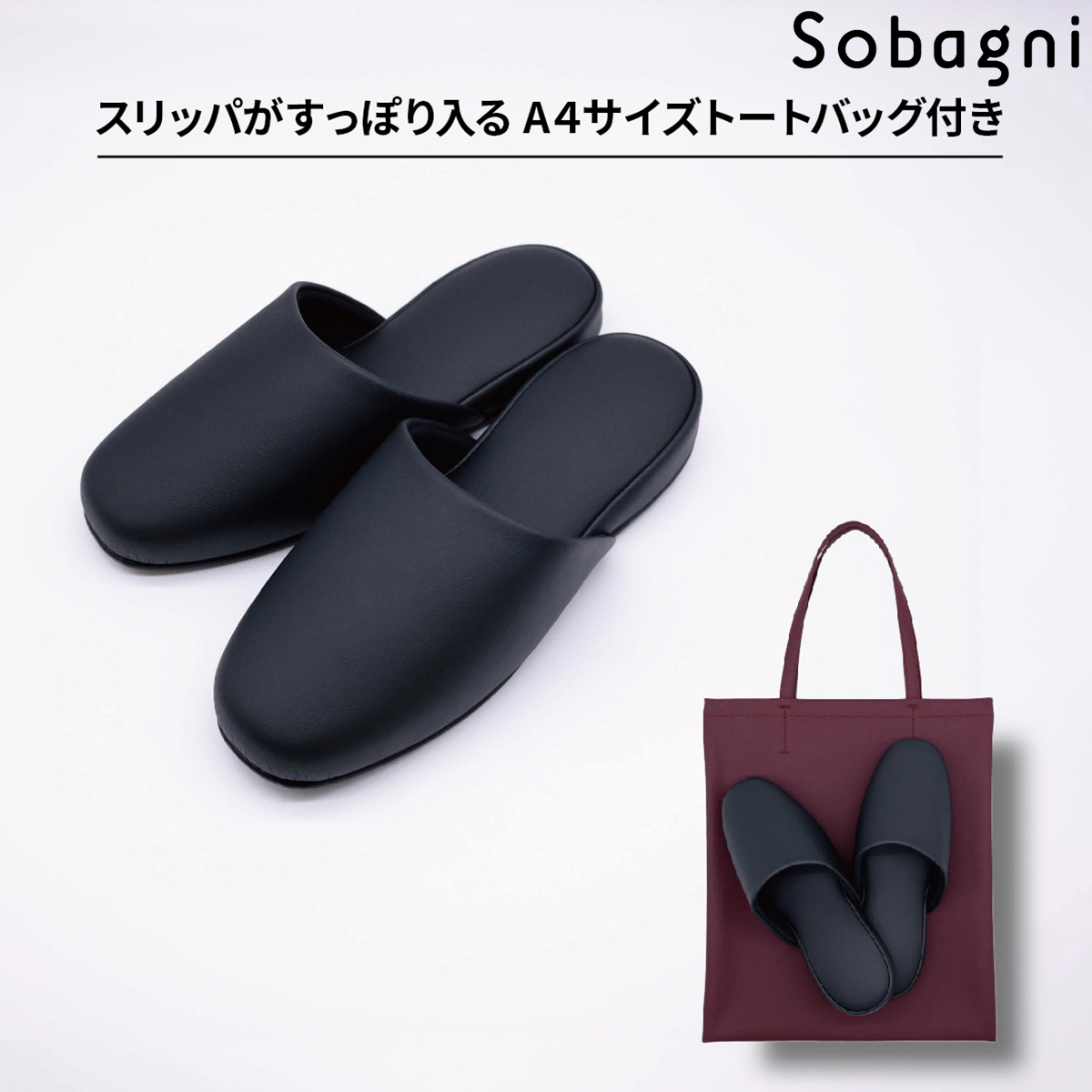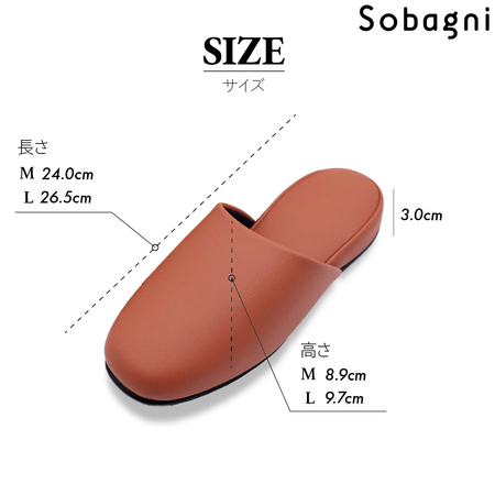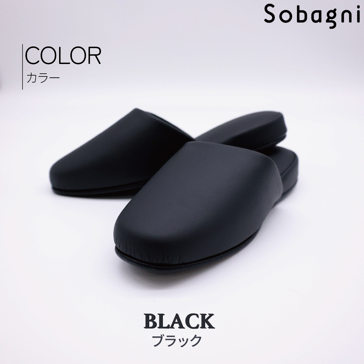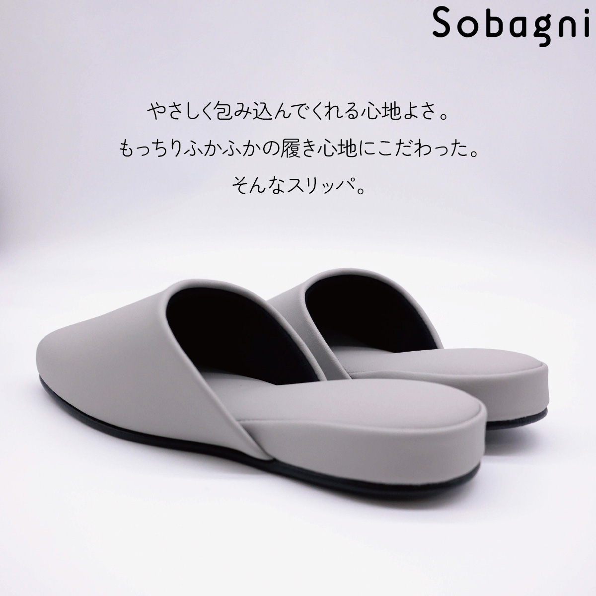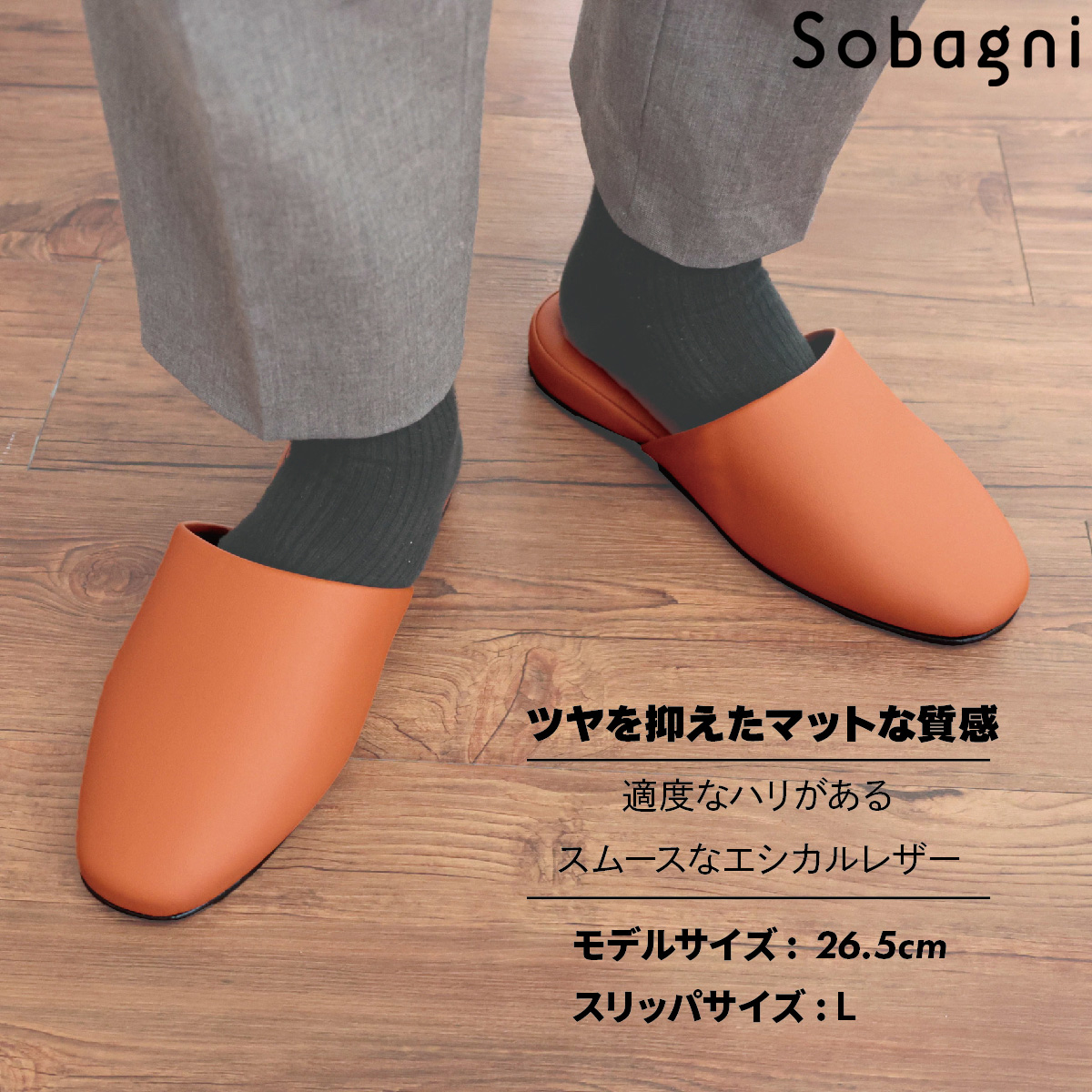 sobagni自社工場で生産された国産エシカル合皮素材を使用し、シンプルながら上品で高級感あるスリッパです。
