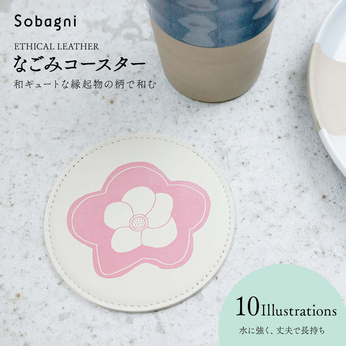 ソバニ公式 なごみコースター 国産エシカル合皮 茶托 コースター 和柄 ステッチ ホワイト イラスト イクタケマコト 撥水 防水 防汚 お手入れ簡単 汚れに強い ウォッシャブル 日本製 合皮 かわいい 丸型 和柄 【メール便】