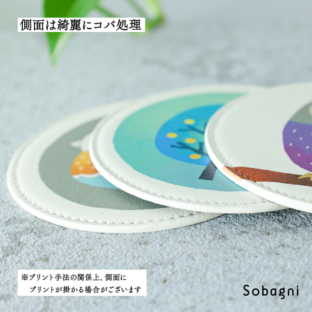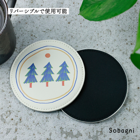 ソバニ公式 北欧コースター 国産エシカル合皮 コースター ステッチ イラスト イクタケマコト 撥水 防水 防汚 お手入れ簡単 汚れに強い ウォッシャブル 日本製 合皮 合成皮革 かわいい 丸型 洋柄 インテリア雑貨 ギフト リバーシブル 【メール便】