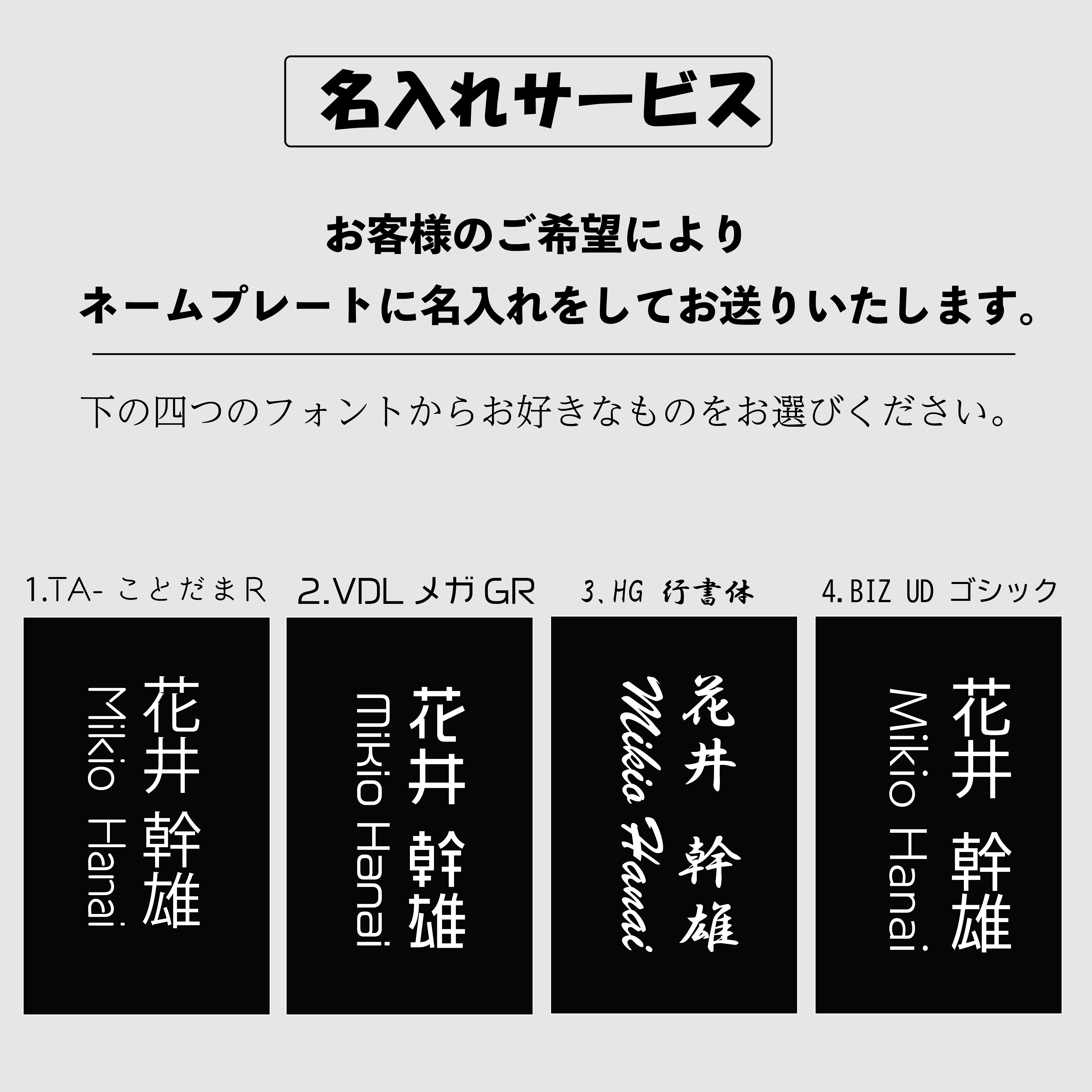 お客様のご希望により、ネームプレートに名入れをしてお送りいたします。