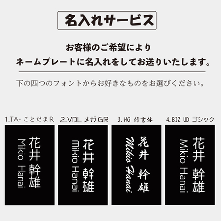 ネームプレートに名入れサービスを行っています。 上記4つのフォントからお好きなものをお選びになり、こちらに名入れを行うお名前(日本語・ローマ字のみ)をご記入ください。会社名や電話番号などご希望の方は事前にお問い合わせください。