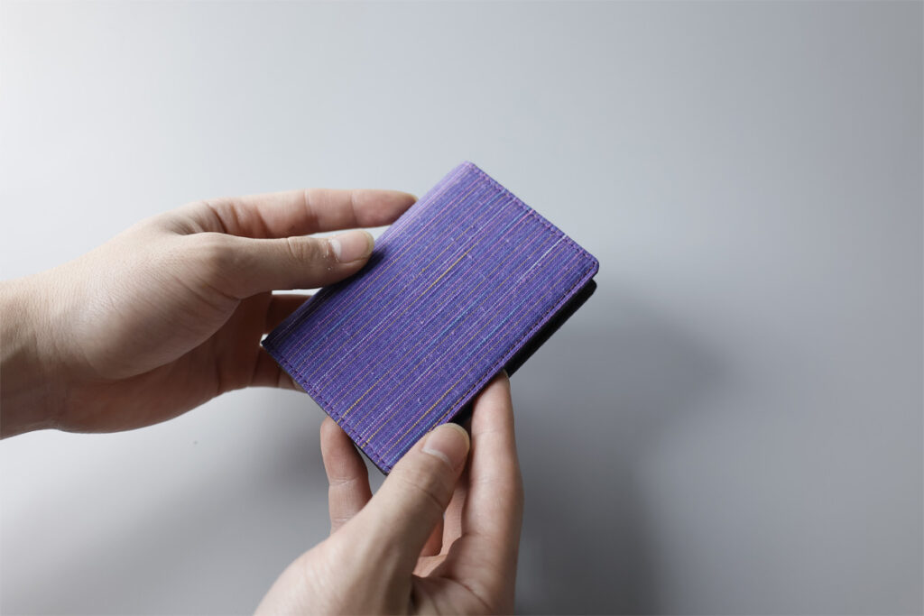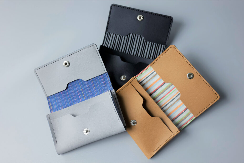 スマートでシンプル、上品な名刺入れの内側に遠州綿紬がおしゃれな逸品。