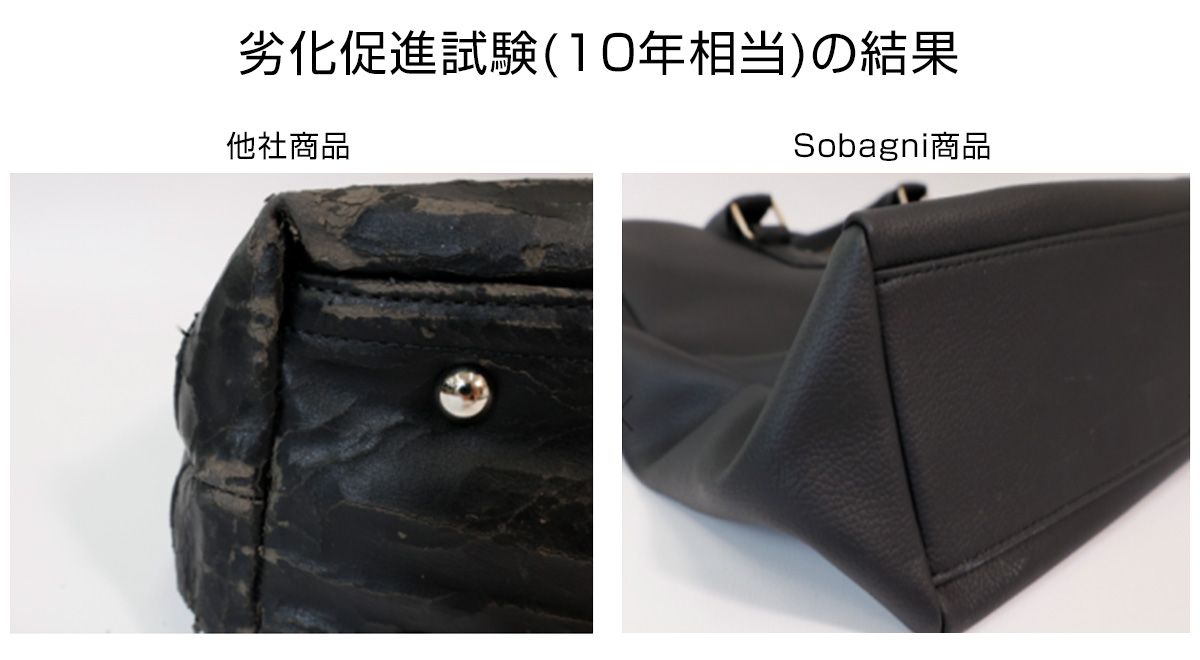 合成皮革はポリエステルなどの生地に、ポリウレタンなどの樹脂を貼り付けて作られています。ボロボロになる素材も、Sobagniの素材もどちらもポリウレタン樹脂です。