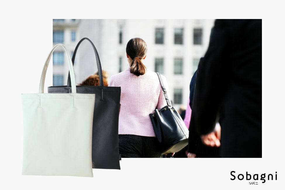 どんな服装やメインバッグでも、控えめに引き立て格上げをしてくれる、それがSobagniのスッキリトートです。