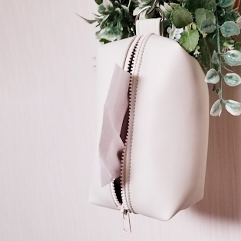 自家用車のシートカバーがライトグレーでその中に置いていても爽やかに見える白でミニティッシュケースを作りました。衛生面と見た目を考えてファスナー付きにしました。