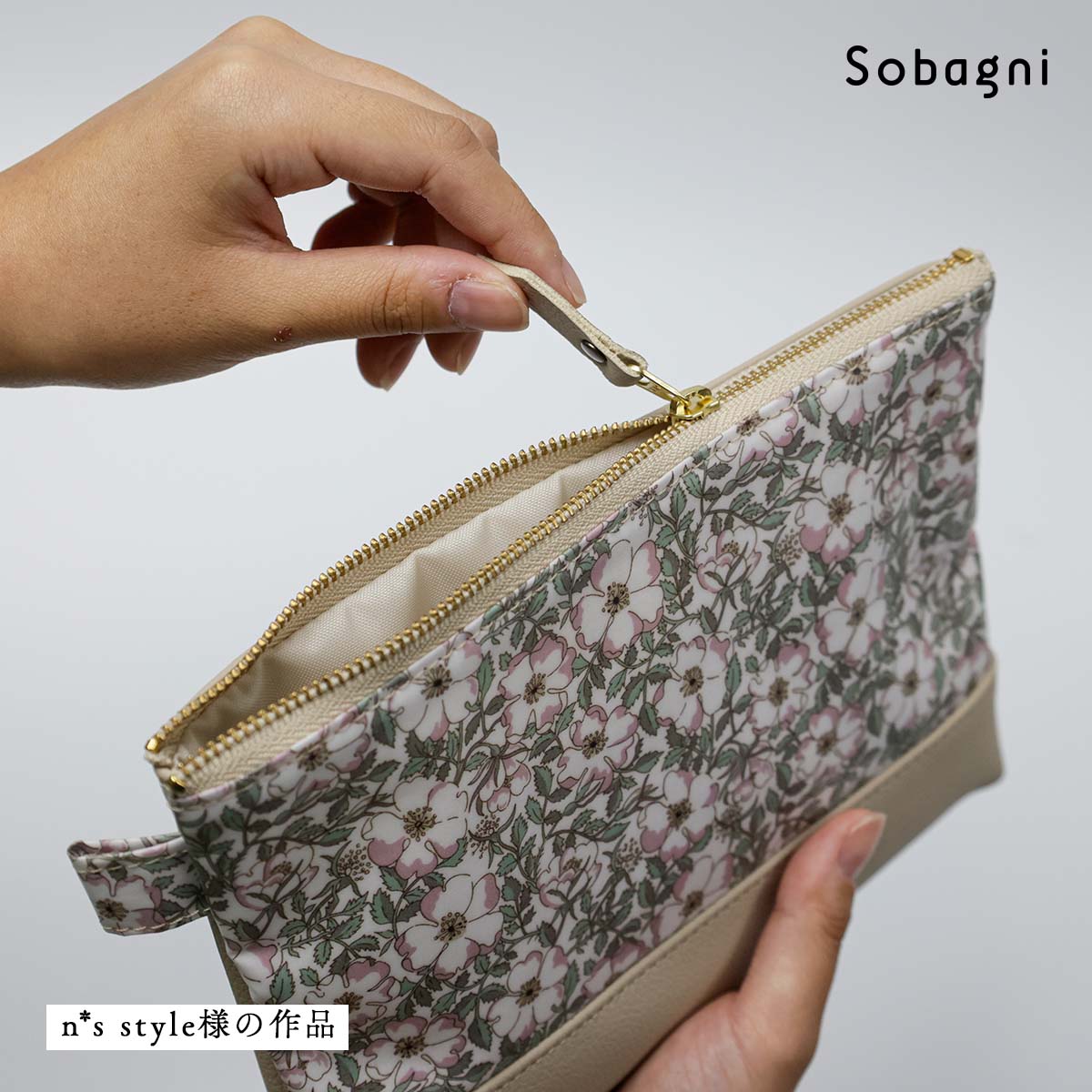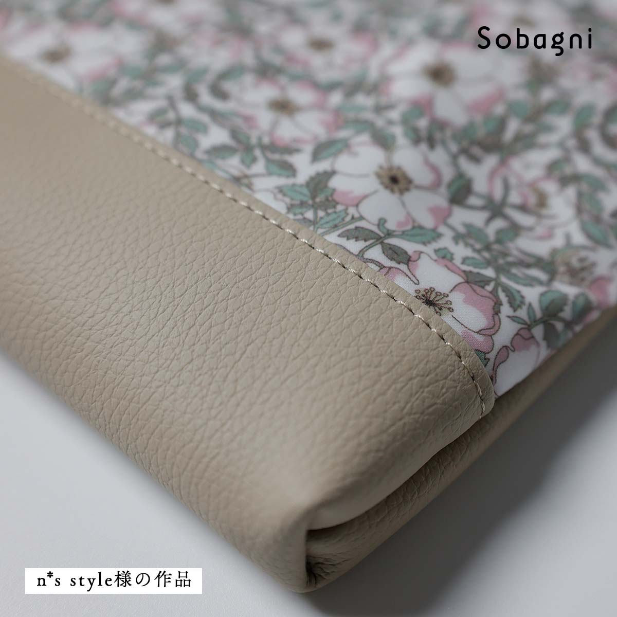 リバティプリントの上品な柄と、Sobagni エシカルソフトのベージュの色合いが引き立て合う、素敵なポーチを作ってくださいました。リバティプリントはラミネート加工がされており、エシカルソフトは防汚性・撥水性がありますので、汚れにくいのも嬉しいポイントですね。
