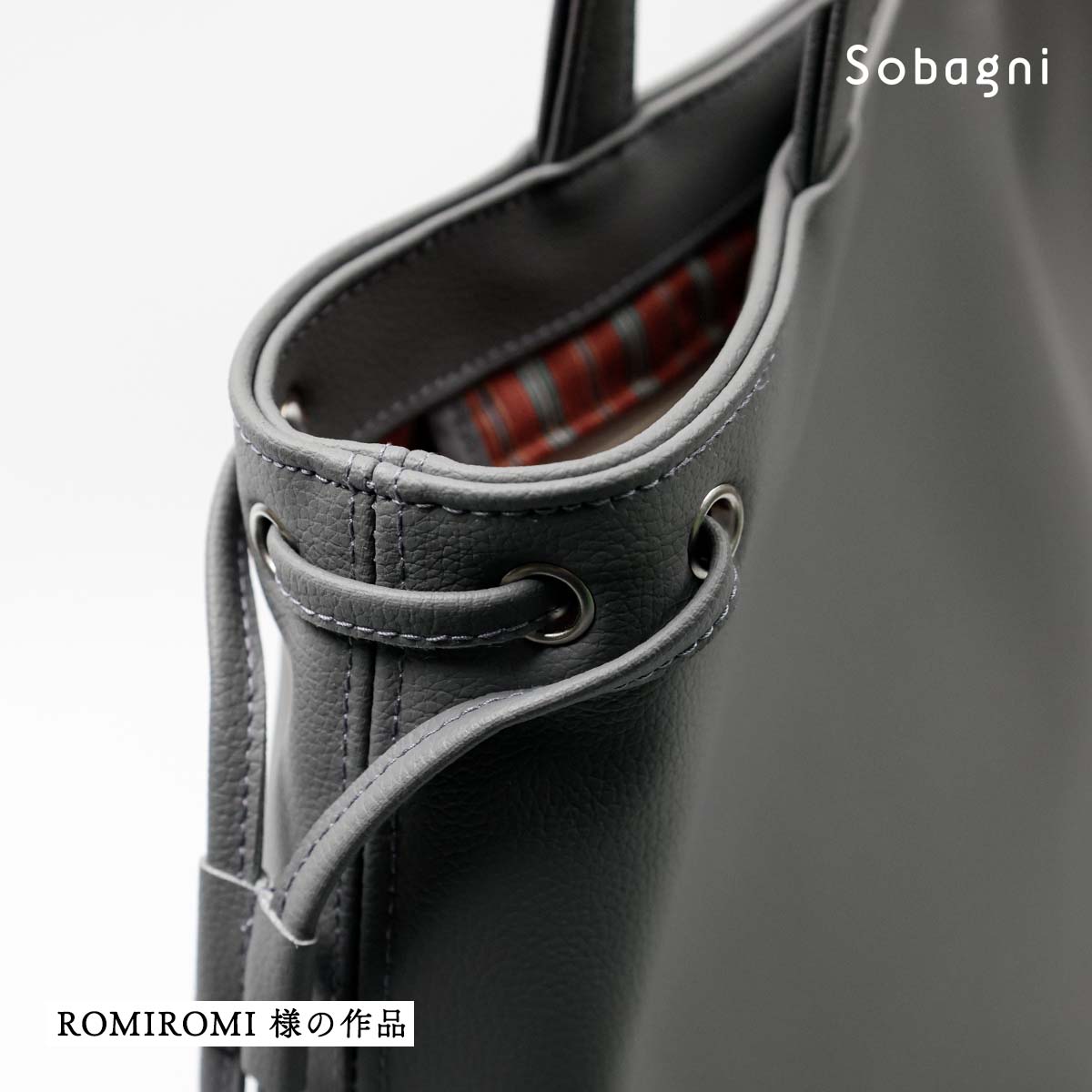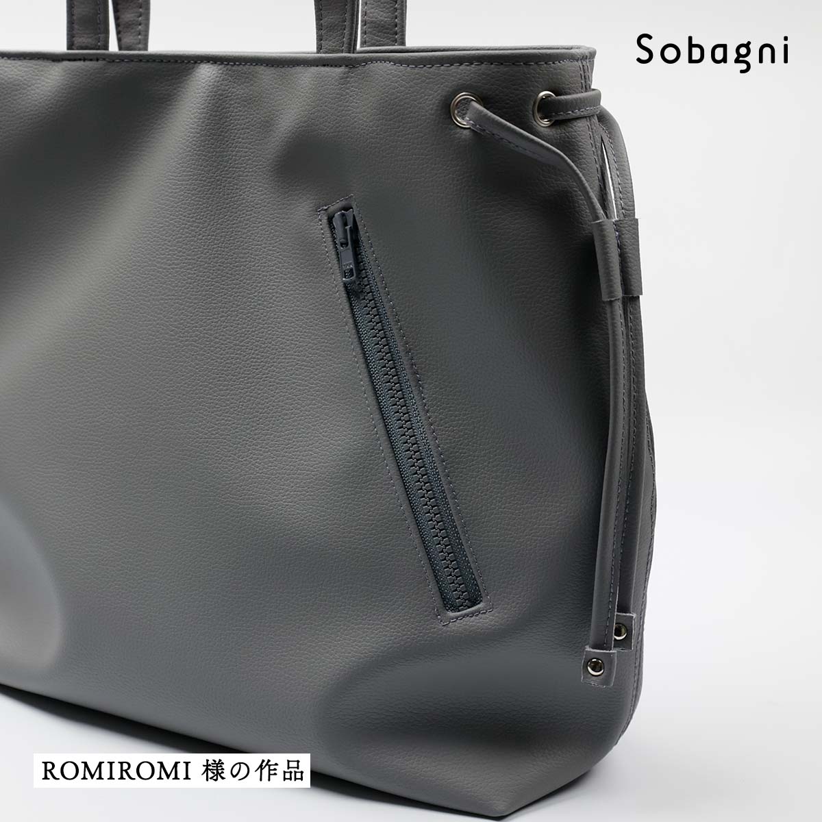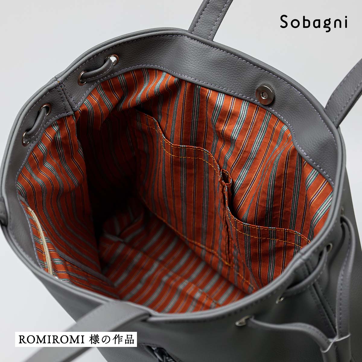 袋もの作家のromi romiさま。「エシカルソフトに出会って、参った!という感じ」と言うその理由は、「布地に負けないくらい、軽いバッグができて、しかも、むちゃくちゃ丈夫そう。」とのこと。持ち手をつけてあるところなど、ゆっくりミシン掛けする必要がある部分はあったそうですが、「全体的にとても縫いやすく、大変扱いやすい」とのご感想をいただきました。