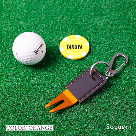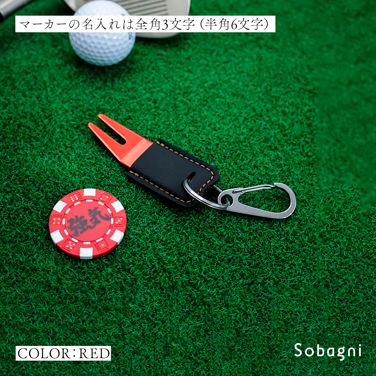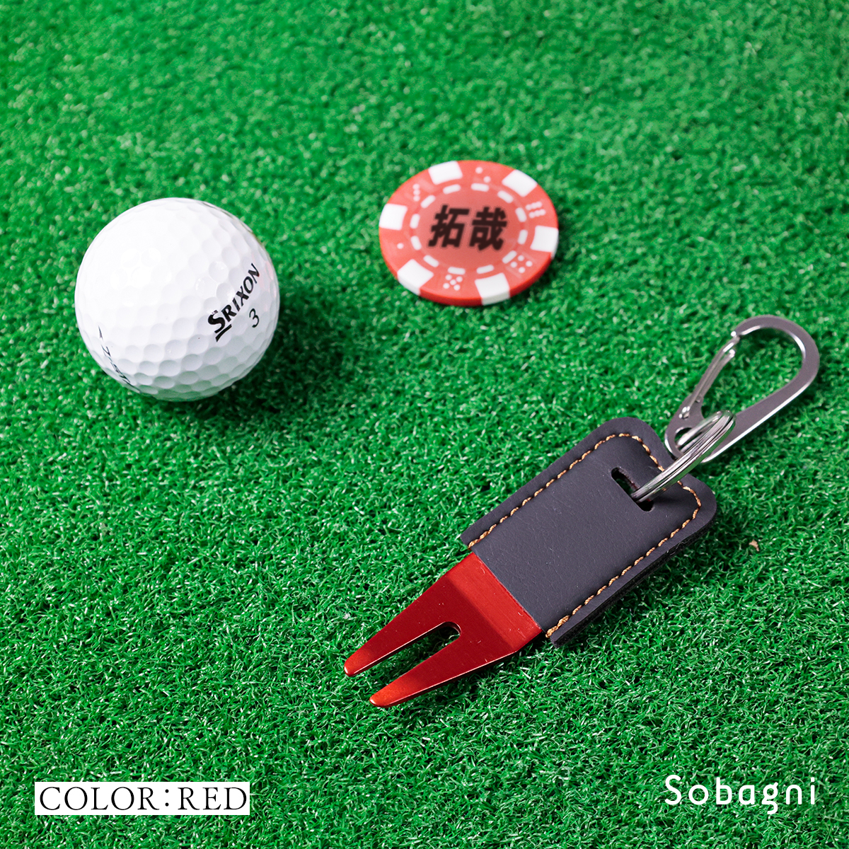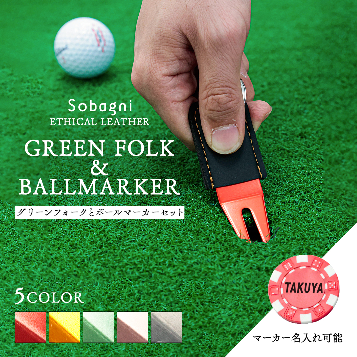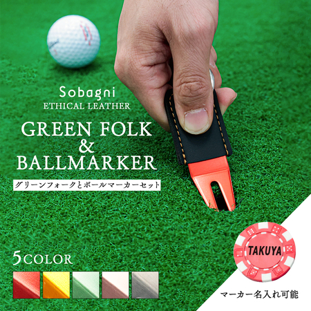 ソバニ公式 グリーンフォーク&名入れボールマーカーセット 名入れサービス オリジナル ゴルフ コンペ 景品 プレゼント ボールマーク 日本製 合皮 合成皮革 国産エシカル合皮 カラビナ付き 赤 シルバー グリーン 計5色 ヴィーガン