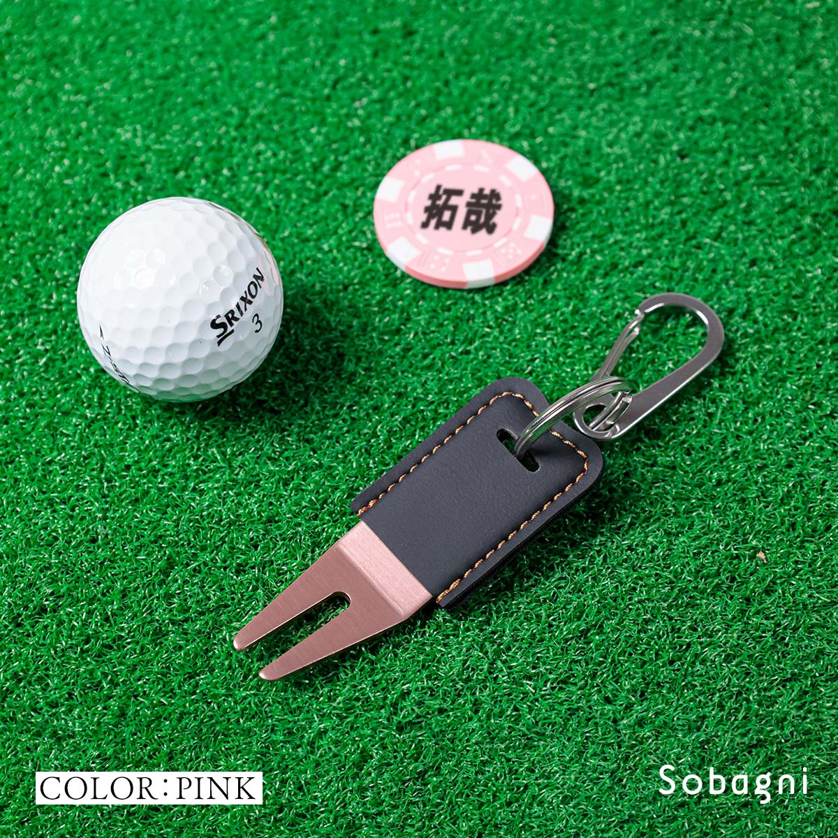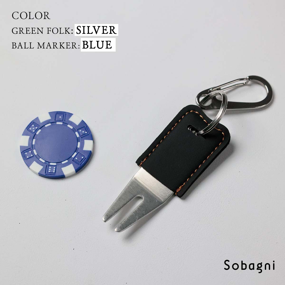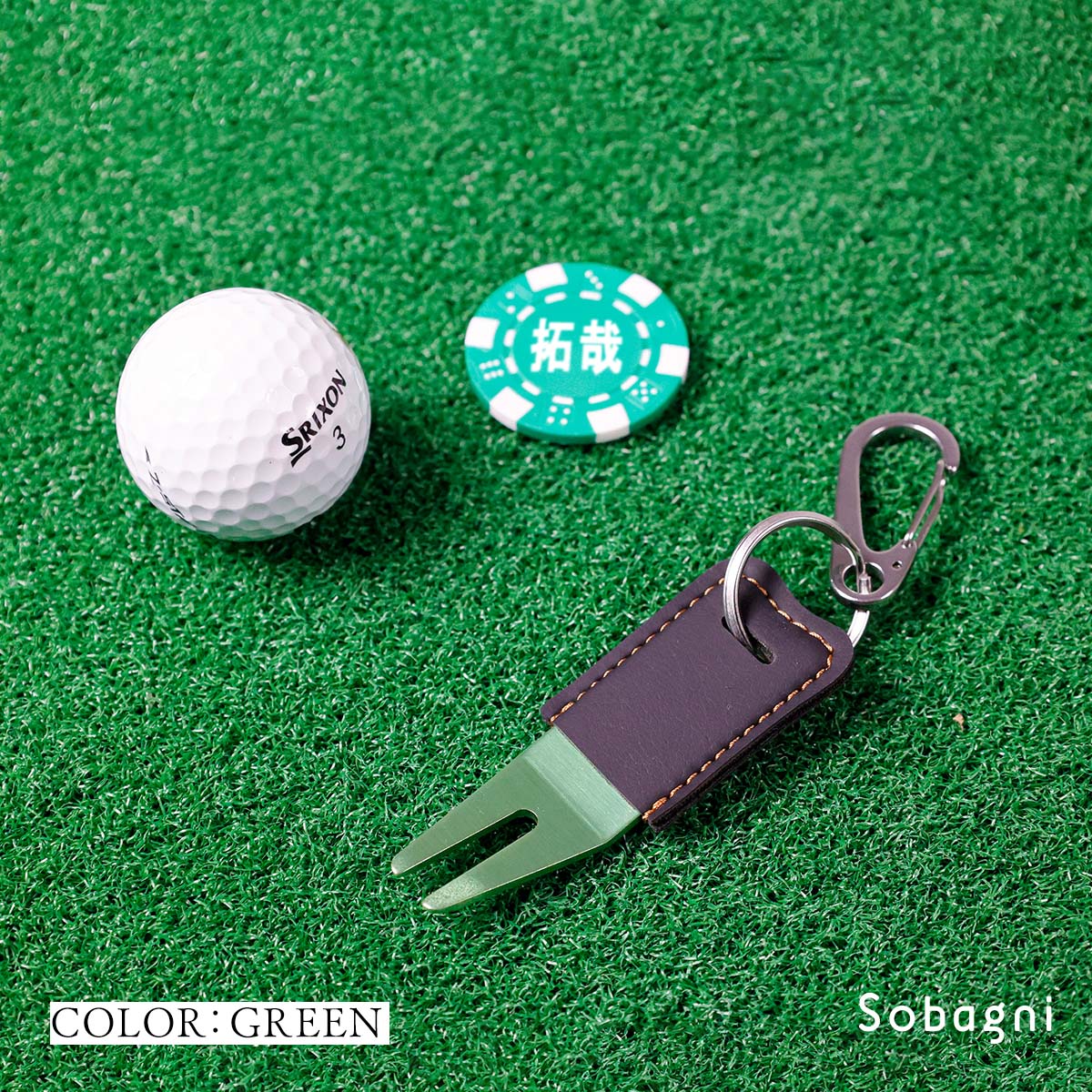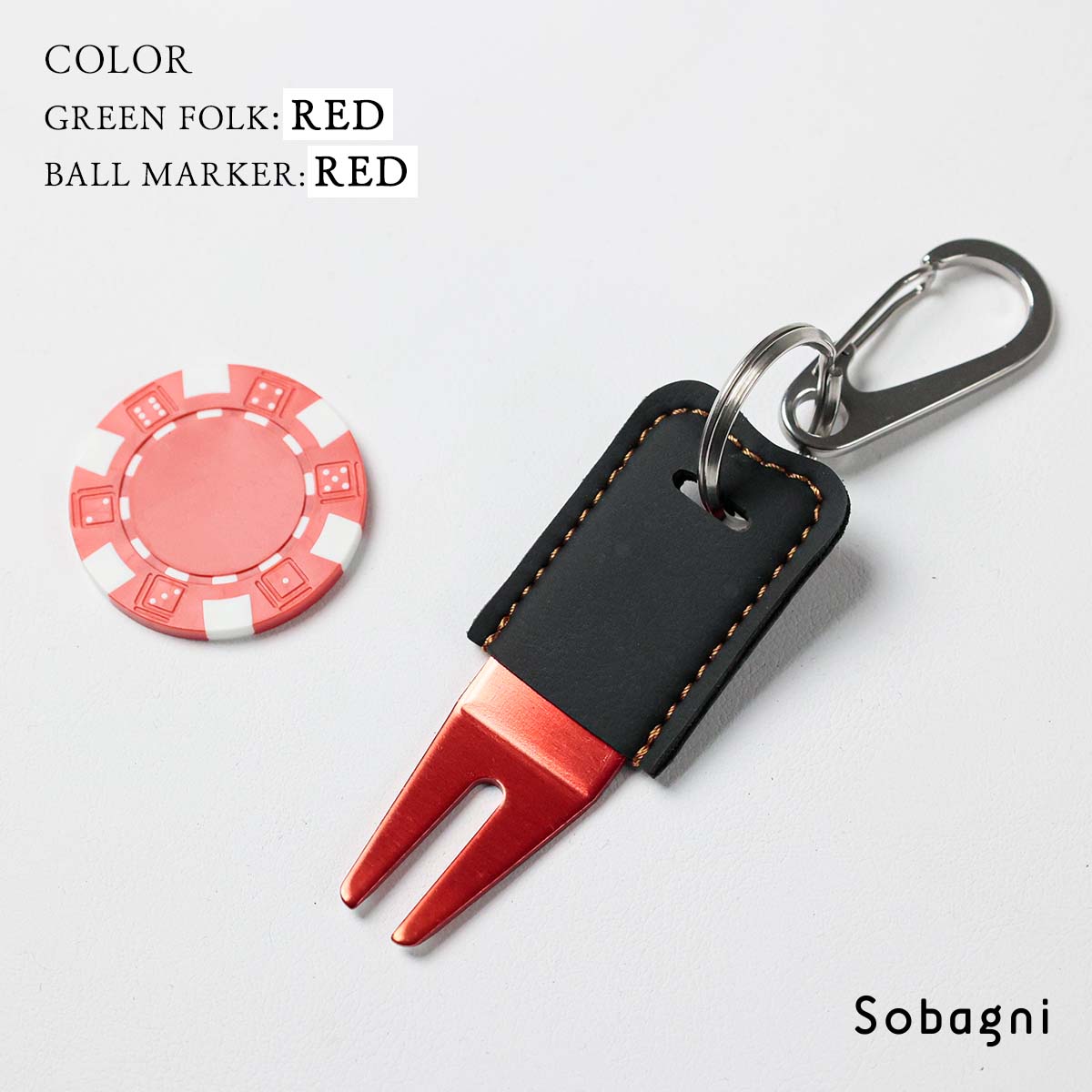 ソバニ公式 グリーンフォーク&名入れボールマーカーセット 名入れサービス オリジナル ゴルフ コンペ 景品 プレゼント ボールマーク 日本製 合皮 合成皮革 国産エシカル合皮 カラビナ付き 赤 シルバー グリーン 計5色 ヴィーガン
