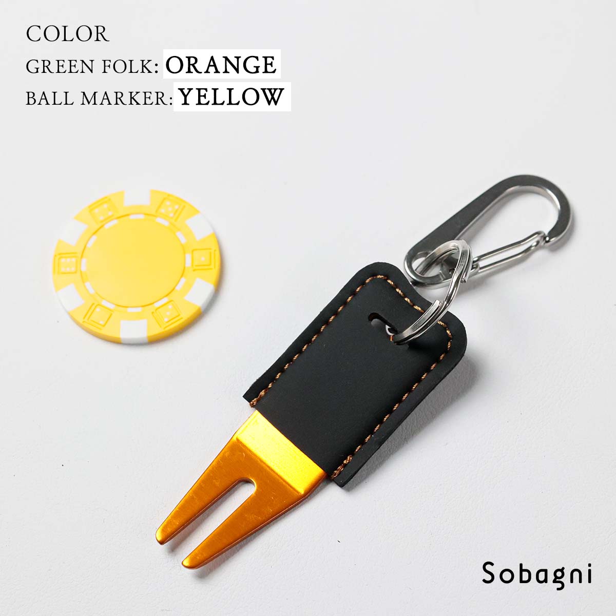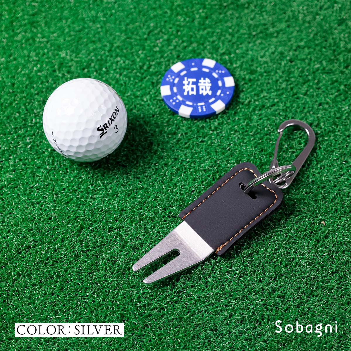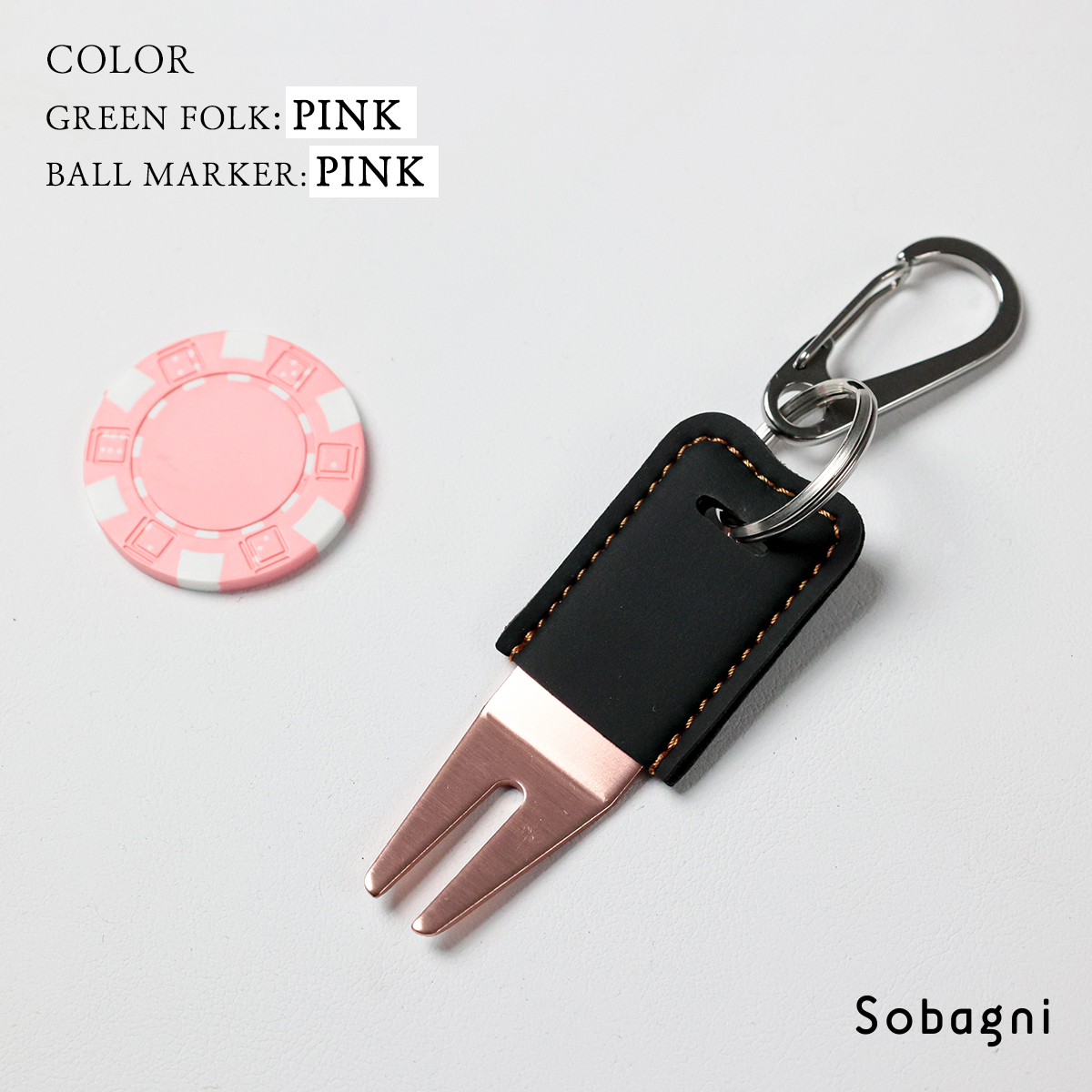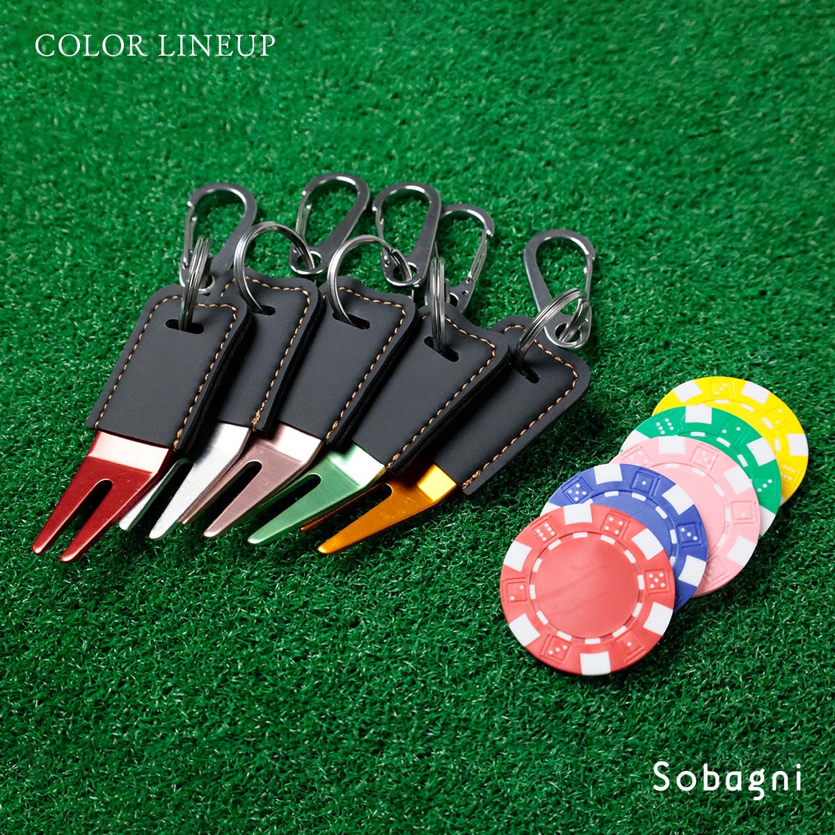 ソバニ公式 グリーンフォーク&名入れボールマーカーセット 名入れサービス オリジナル ゴルフ コンペ 景品 プレゼント ボールマーク 日本製 合皮 合成皮革 国産エシカル合皮 カラビナ付き 赤 シルバー グリーン 計5色 ヴィーガン