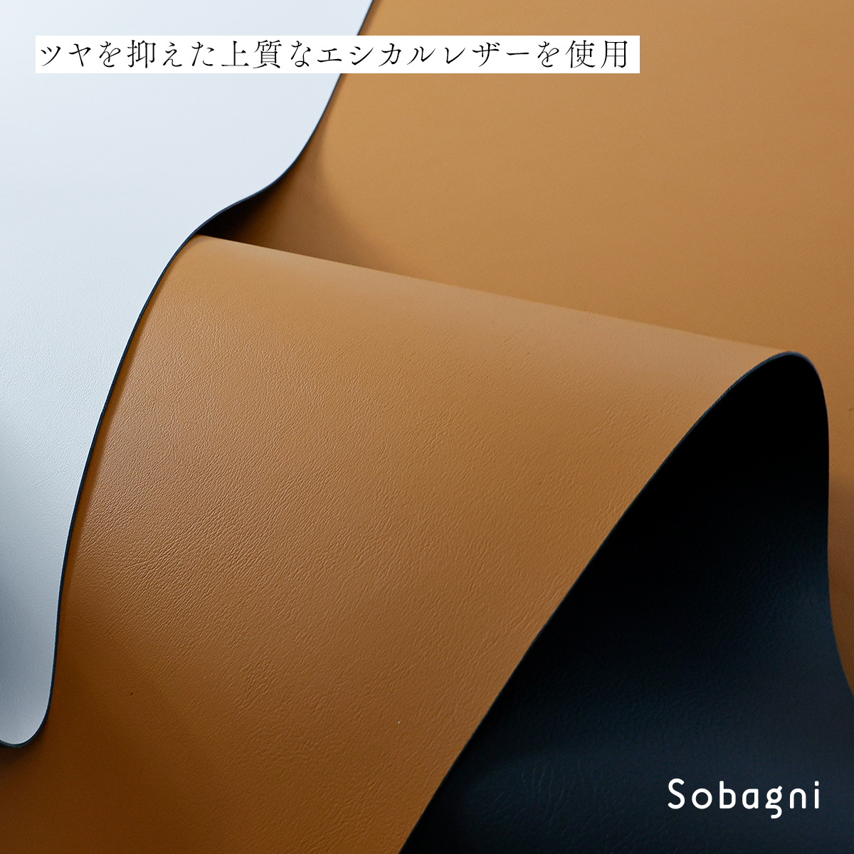 Sobagniのエシカル合皮は上品さを感じるマットな質感。男性にも女性にも、またビジネスマンにも学生さんにも使って頂けるよう、無駄を省いたシンプルなデザインとしております。