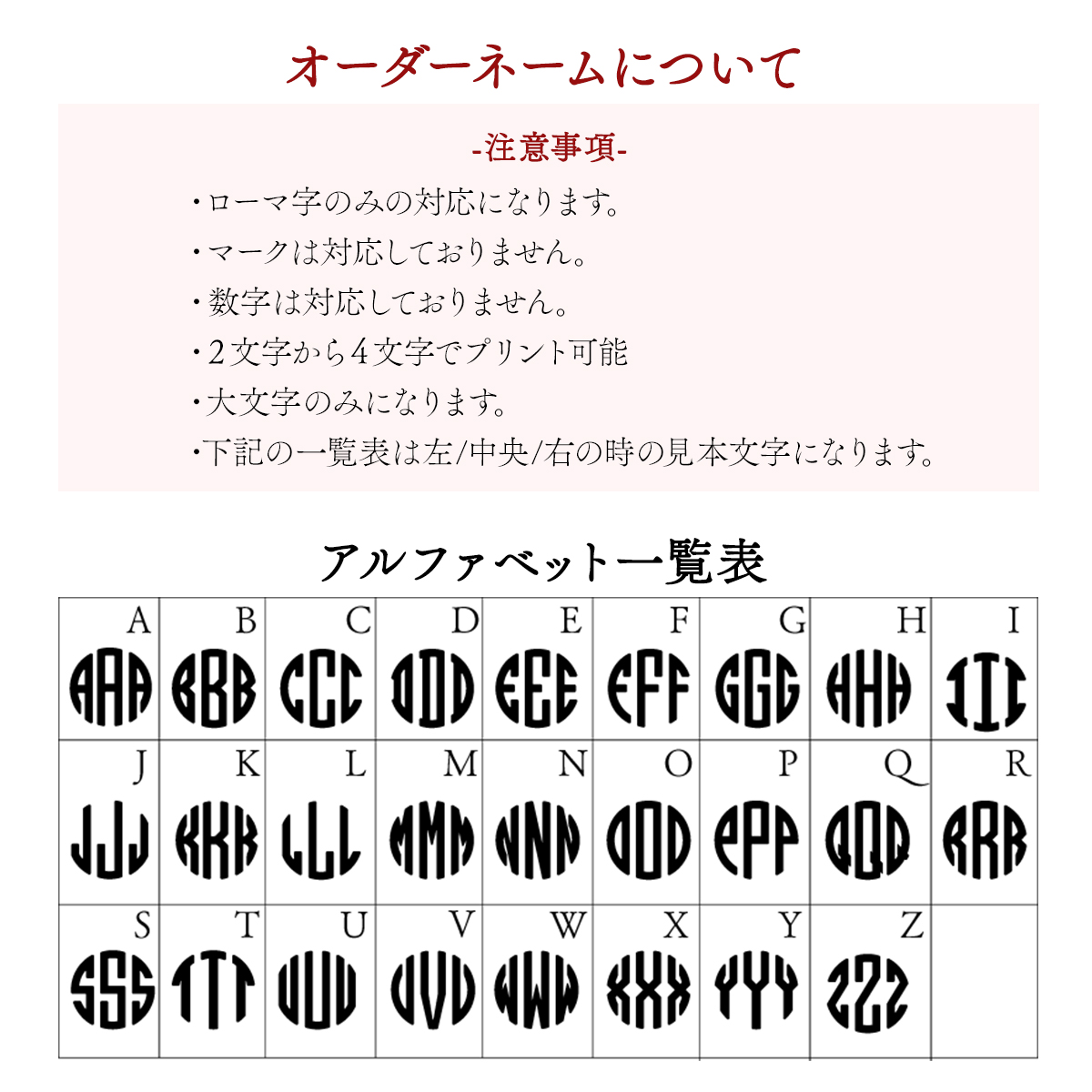 ローマ字で2~4文字の名入れが可能です。(小文字・数字不可)