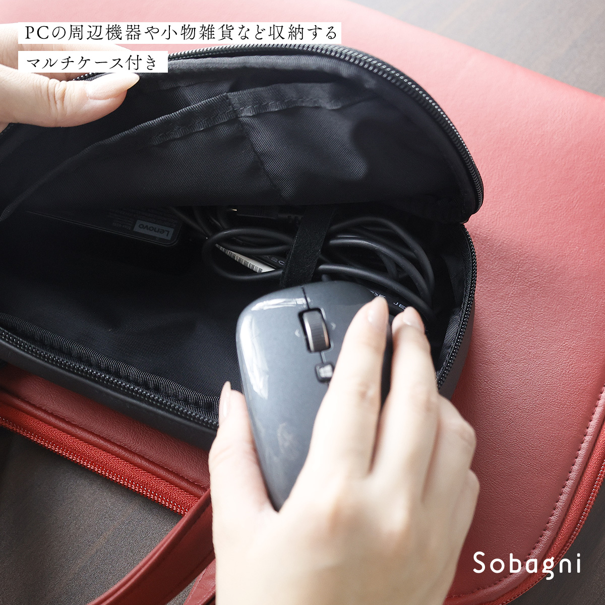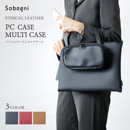 そういった場面を想定して開発をしたのが、この【PCケースとマルチケース】です。PCだけをサッと入れてスマートに持ち運べるケースと、コードやマウスを収納する取り外し可能なマルチケースがセットになっています。