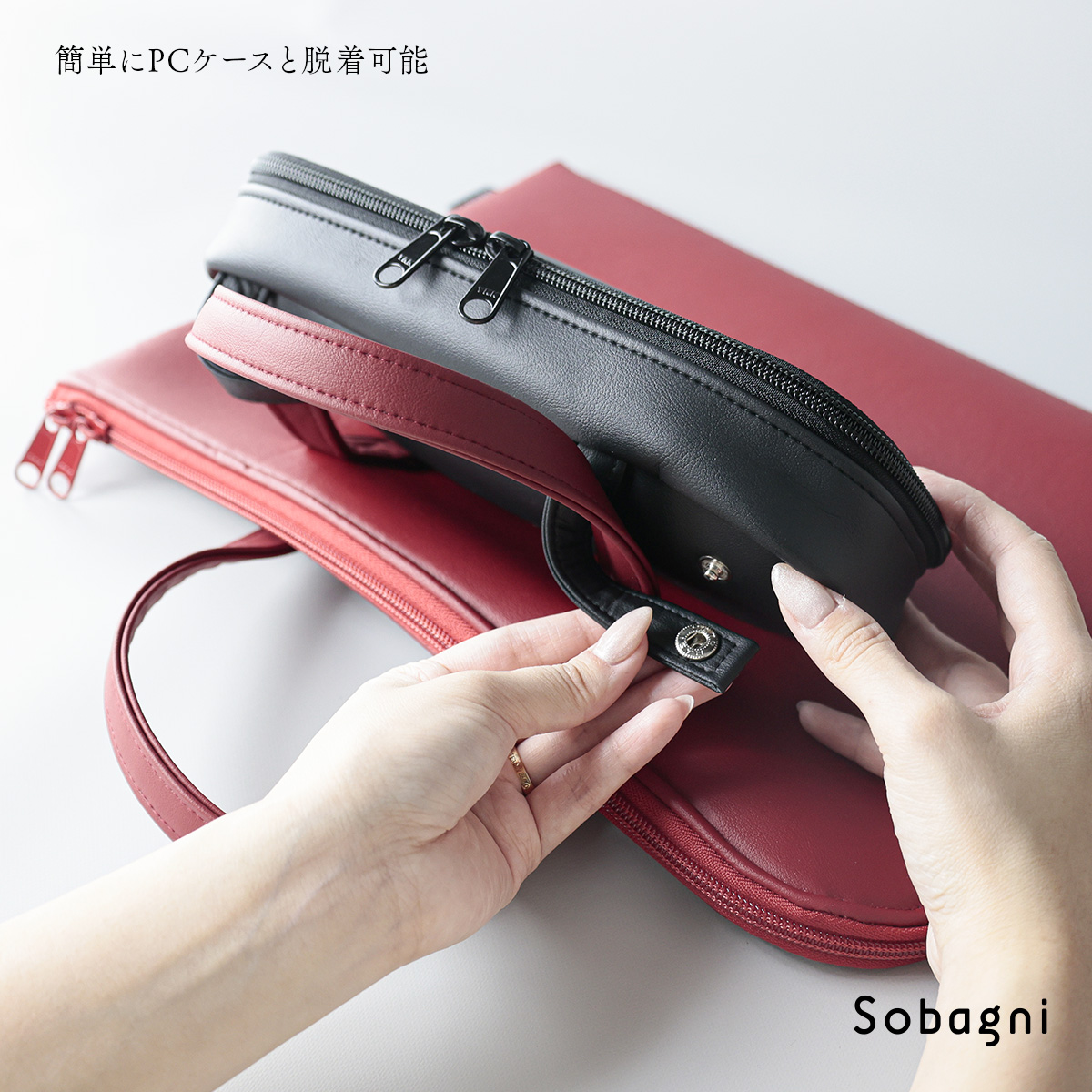 また、PCケースに限らず、お持ちのビジネスバッグやその他の手提げバッグなどに取り付けることも出来ます。