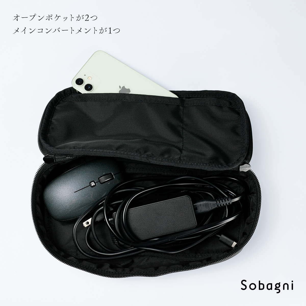 マルチケースにはマウスやスマートフォンが入れられる大き目のポケットが1つと、USBメモリーなどが入れられる小さめのポケットが1つございます。