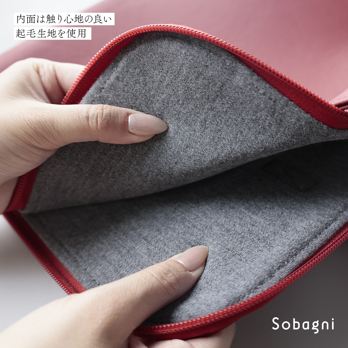 また、大事なPCに傷かつかないよう、インナーには柔らかい起毛生地を採用しました。