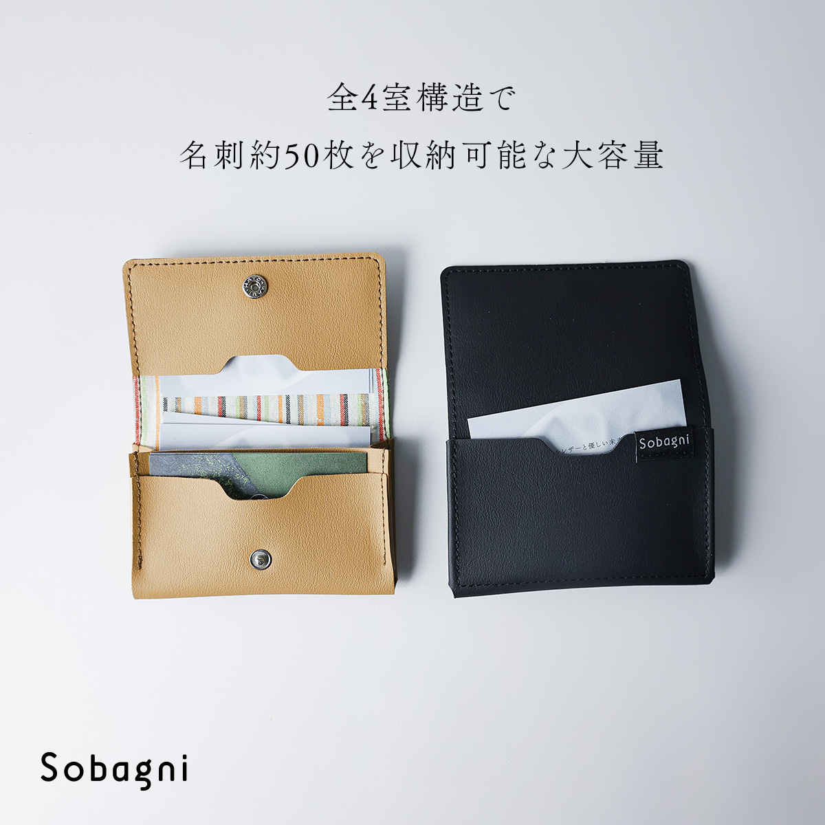 名刺約50枚を収納可能な大容量の主室に加え、カードポケット3室の全4室構造。名刺の仕分けができたり、カード類などを入れられる設計になっております。