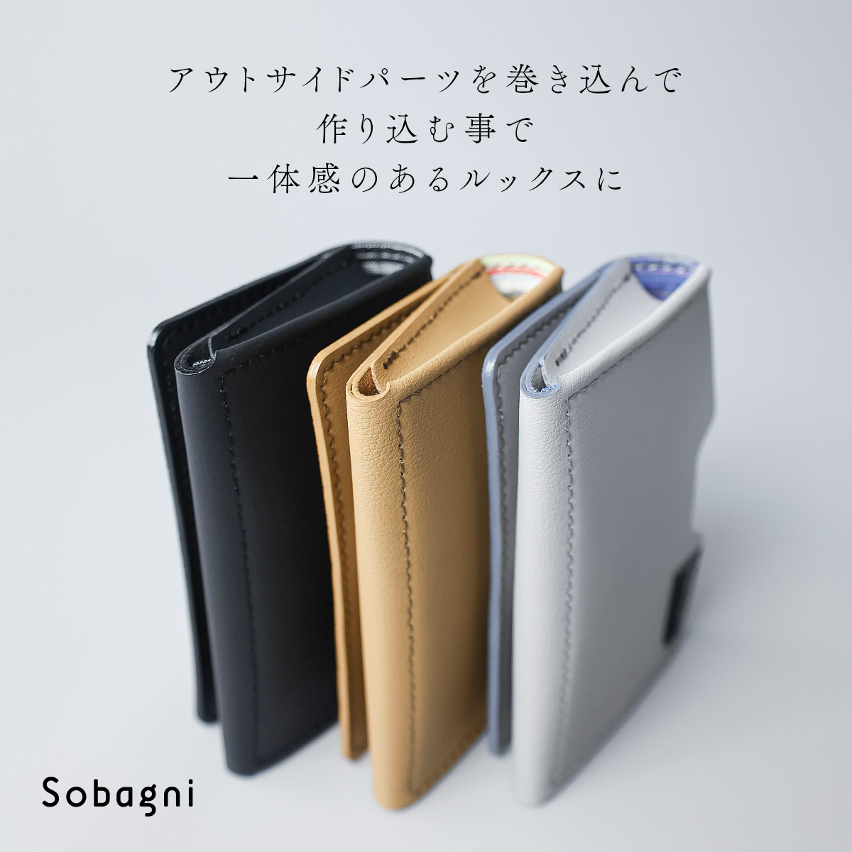 サイドのマチは、アウトサイドパーツを巻き込む事で、一体感のあるルックスに仕上がっています。断面が重なる所は、表皮同様に艶消しのコバ仕上げをする事で高級感を演出しています。
