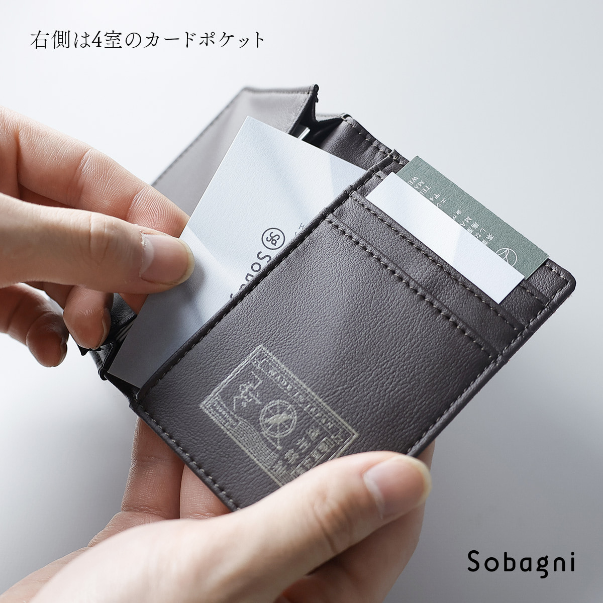 名刺約40枚を収納可能な大容量の主室の他、名刺サイズのポケットが2室、クレジットカードサイズのポケットが3室の全6室構造。名刺の仕分けができたり、カード類などを入れられる設計になっております。