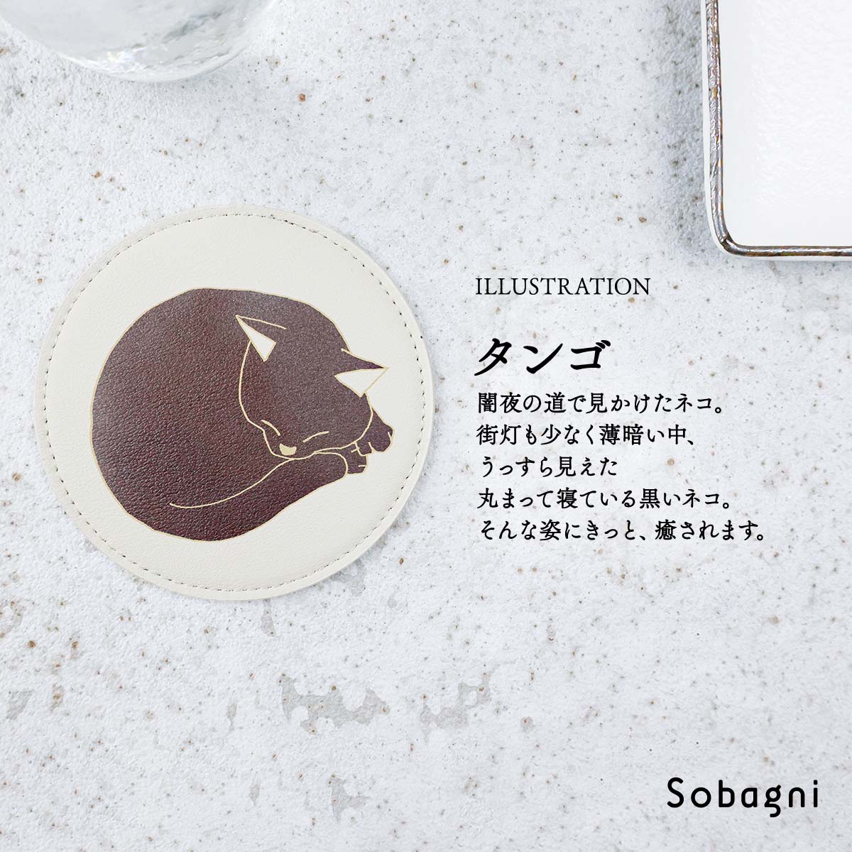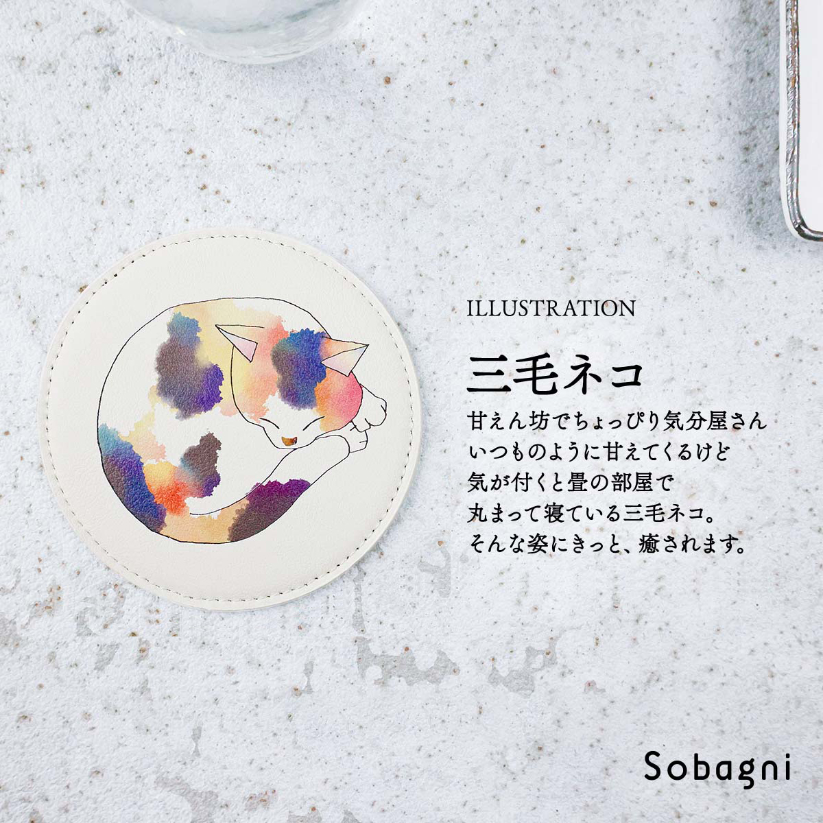 ソバニ公式 丸まりネコースター コースター イラスト イクタケマコト 高耐久 撥水 防水 防汚 お手入れ簡単 汚れに強い ウォッシャブル かわいい 丸型 ネコ ねこ 猫 ギフト ゆるかわ 合皮 合成皮革 国産エシカル合皮