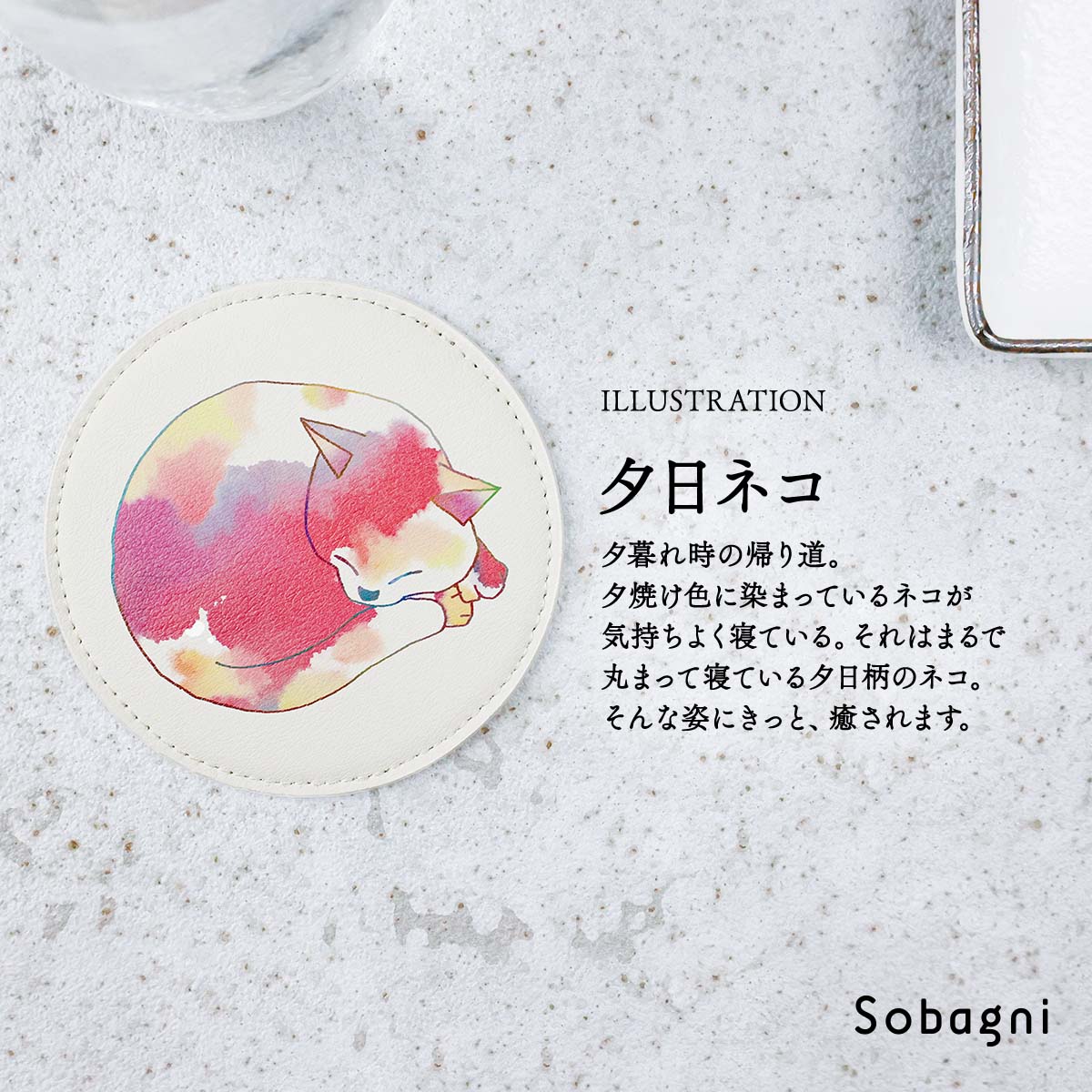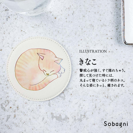 ソバニ公式 丸まりネコースター コースター イラスト イクタケマコト 高耐久 撥水 防水 防汚 お手入れ簡単 汚れに強い ウォッシャブル かわいい 丸型 ネコ ねこ 猫 ギフト ゆるかわ 合皮 合成皮革 国産エシカル合皮