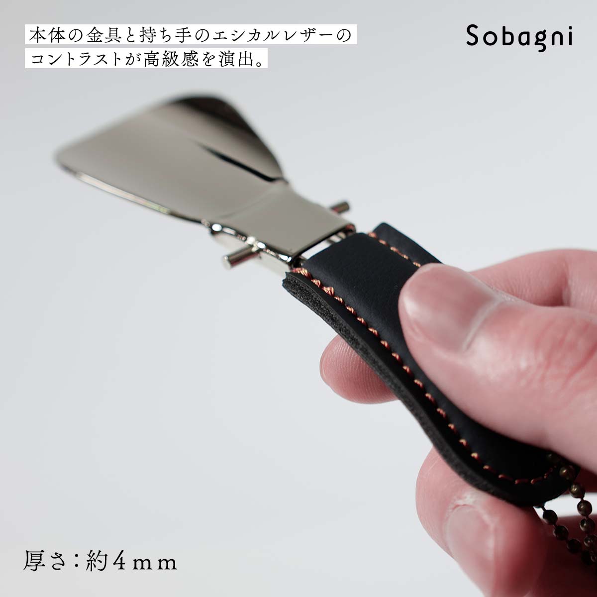 クルマのシート材にも使われているエシカル合皮で持ち手部分を仕立てた折り畳み靴ベラです。