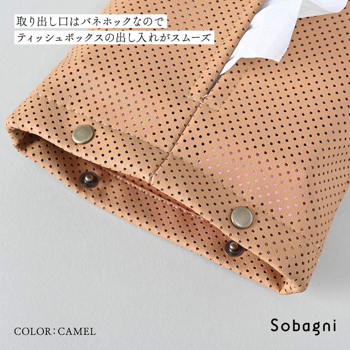 その中でも高級かつスタイリッシュに感じるパンチング合皮を使用することで、生活感が出がちなティッシュケースをインテリアとして楽しむことができます。