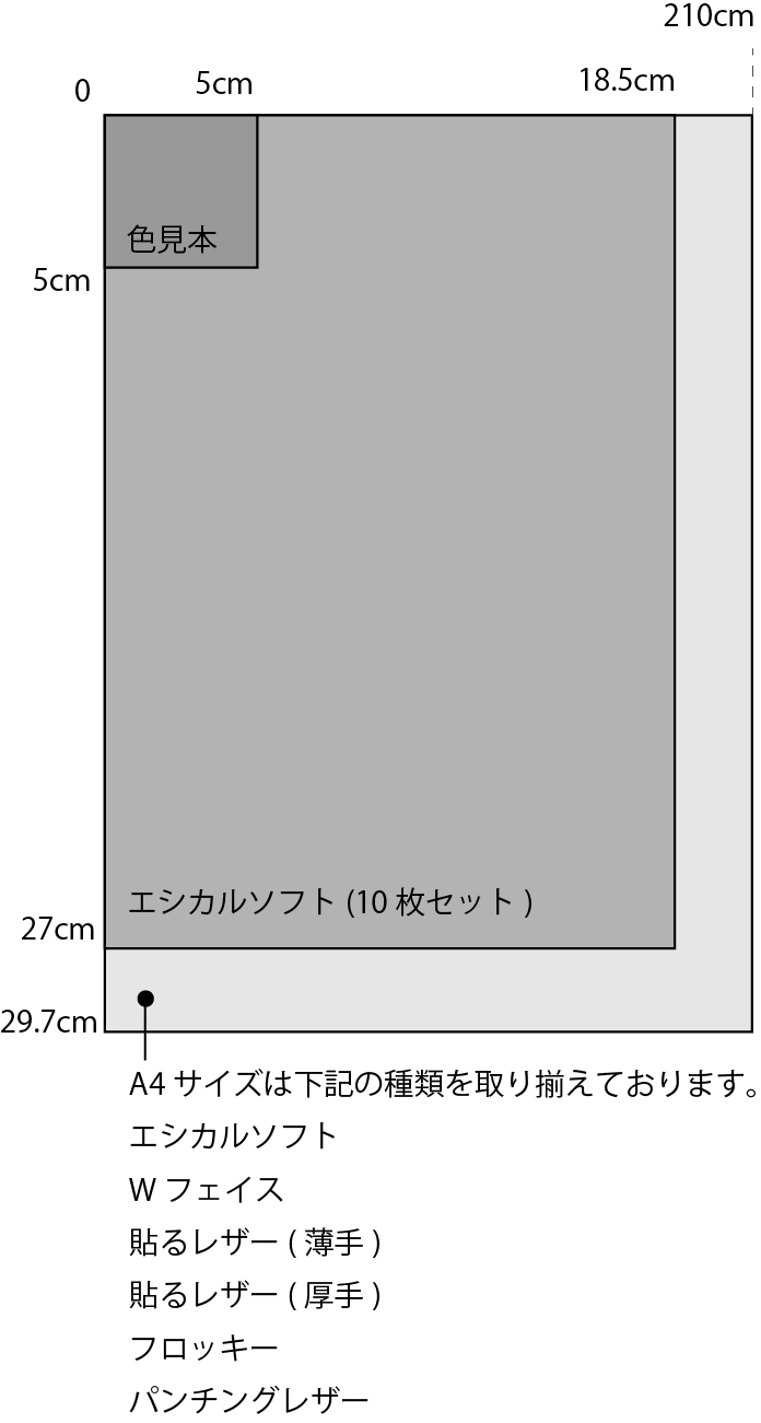 | A4(29.7cm) | エシカルソフト Wフェイス 貼る合皮(薄手) 貼る合皮(厚手) フロッキー パンチング合皮 | ||||||||