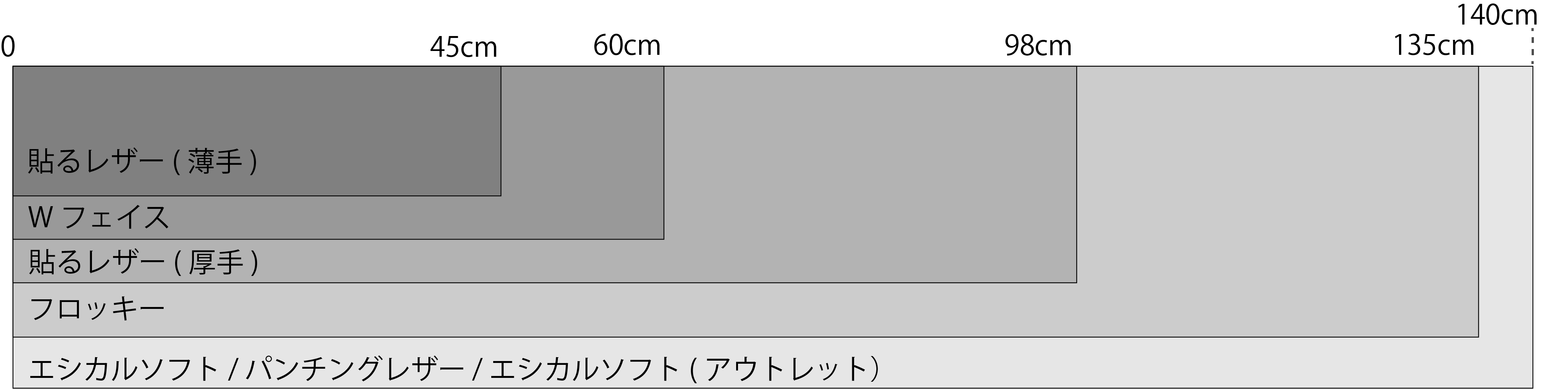 | 10cm単位 | 貼る合皮(薄手) | Wフェイス | 貼る合皮(厚手) | フロッキー | エシカルソフト パンチング合皮 | ||||