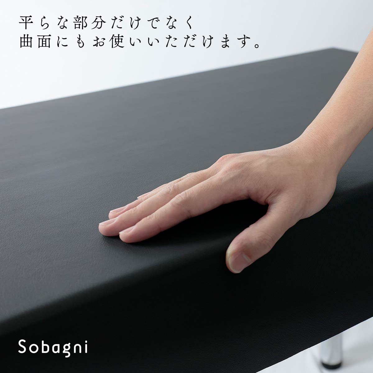 テーブルやイスの天面など平らな部分にお使いいただきやすい素材です。曲面にもお使いいただけますが、Rがきつい面などは扱いにくい場合もございます。