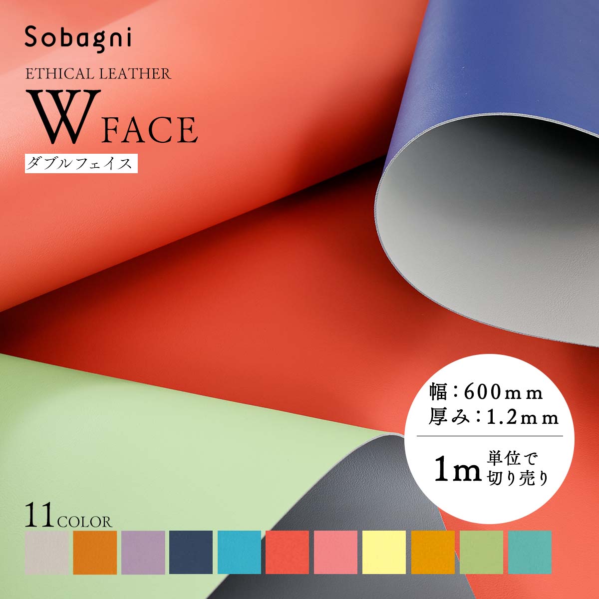 ソバニ公式 Wフェイス m売り 国産エシカル合皮 フェイクレザー ダブルフェイス リバーシブル 両面合皮 自社生産 工場直販 生地 ハンドメイド 手芸 雑貨用 軽い 軽量 60cm幅 高耐久 撥水 防水 日本製 合皮 合成皮革 ツヤなし マット仕上げ ヴィーガン 1.20mm厚 白 茶 青 計11色