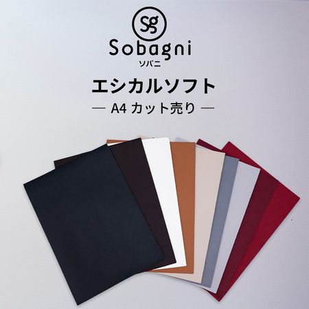 Sobagni ソバニ公式 エシカルソフト A4カット売り A4サイズ 国産エシカル合皮 フェイクレザー 自社生産 工場直販 生地 コスプレ スカート ぬいぐるみ ハンドメイド 手芸 イス張り 椅子張り ソファー 張り替え 舞台衣装 雑貨用 軽い 軽量 伸びる 伸縮性 広幅 高耐久 撥水 防水 防汚 ポリカーボネート 加水分解しない お手入れ簡単 日本製 合皮 合成皮革 ツヤなし マット仕上げ 1.20mm厚 ブラック グレー ホワイト ベージュ ブラウン レッドダリア ライトグレー ダークブラウン ダークレッド