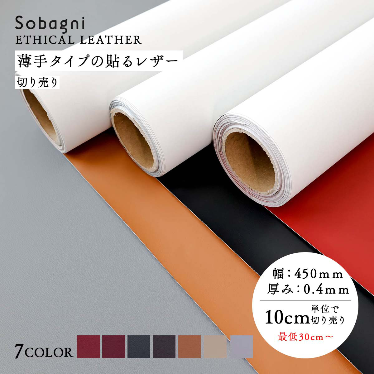 ソバニ公式 薄手タイプの貼る合皮 【30センチより10センチ単位で購入可能】 粘着 オリジナル素材 日本製 エシカル 合皮 フェイクレザー 手貼り 粘着付き 合皮 低グロス マット 肌触り ヴィーガン 45cm幅 0.37mm厚 ストレッチ ブラック ブラウン レッド 計7色
