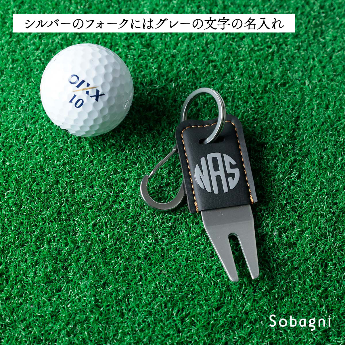 ソバニ公式 名入れグリーンフォーク ゴルフ golf ゴルファー ボールマーク 名入れ 景品 ギフト 贈り物 プレゼント 高級 上質 お手入れ簡単 日本製 合皮 フェイクレザー カラビナ付き レッド シルバー グリーン 計5色 ヴィーガン