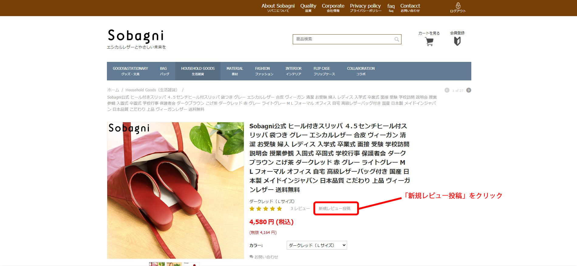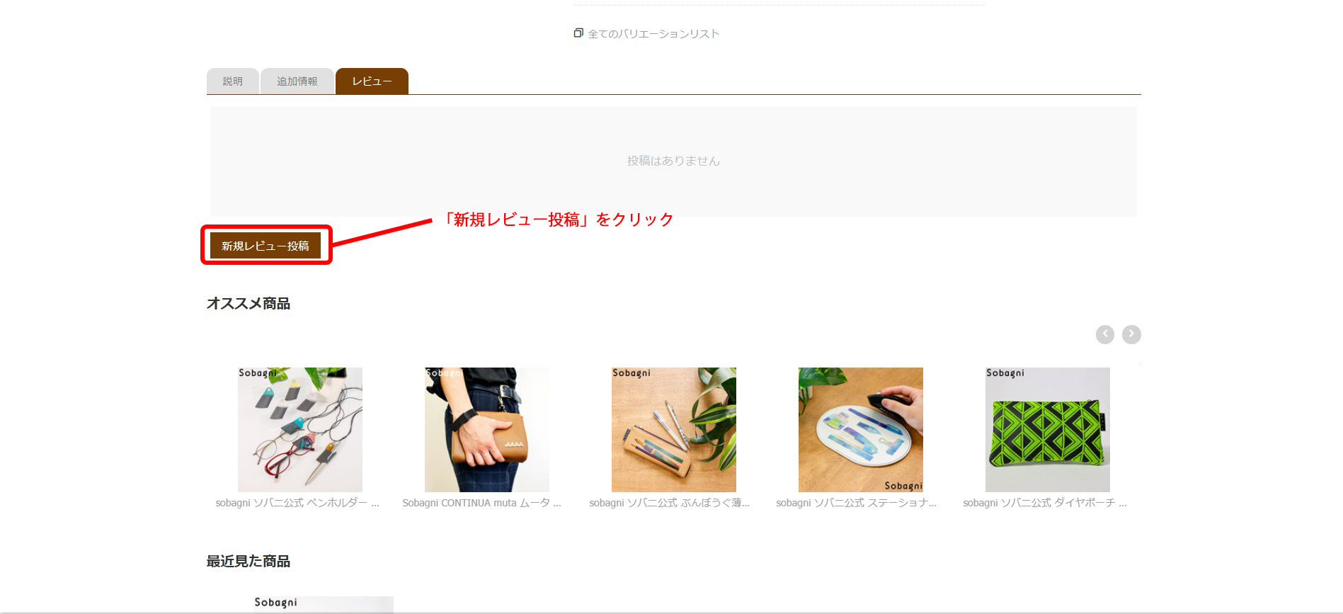 ご購入いただいた商品の商品ページの商品画像の右、「新規レビュー投稿」をクリックしてください。
